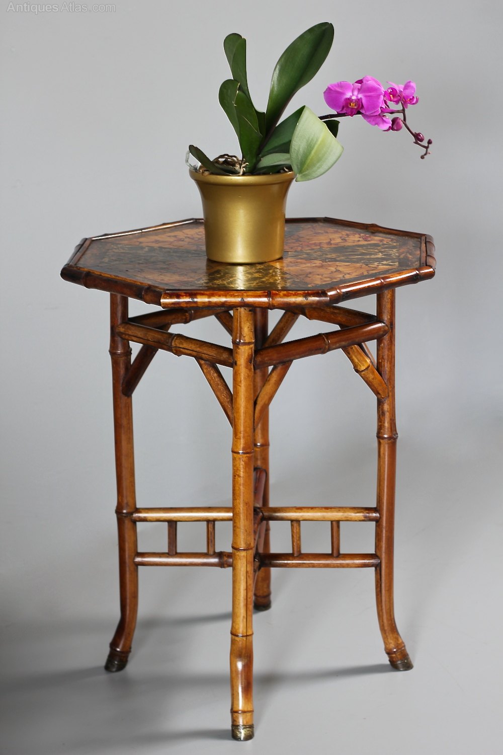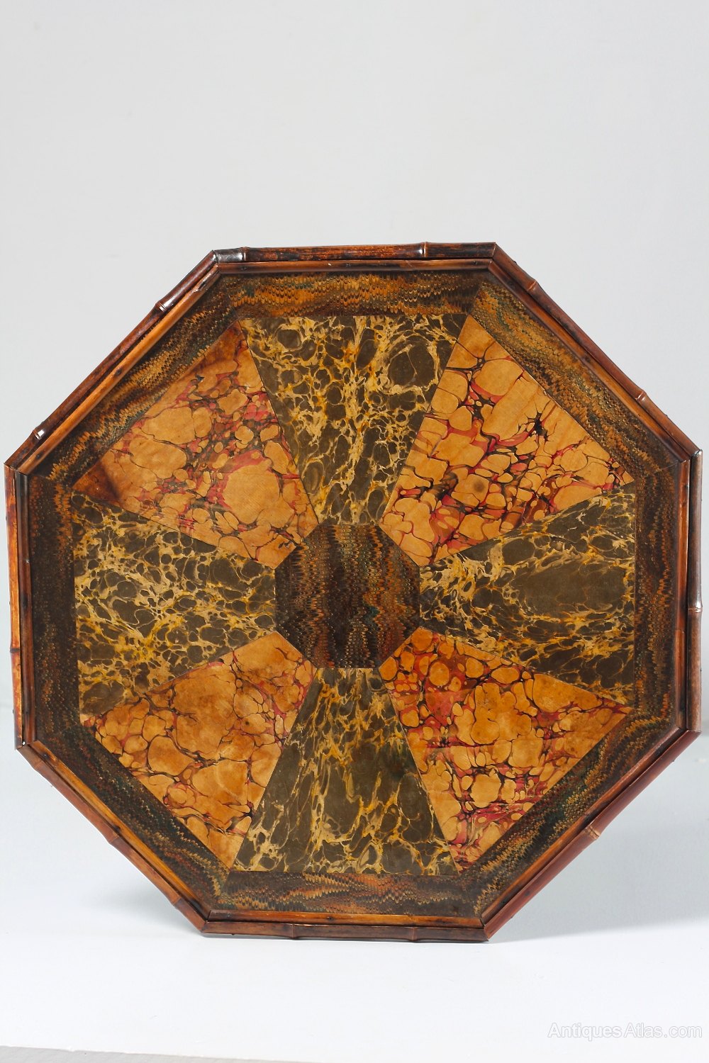 A most attractive occasional table that celebrates the vogue for bamboo antique furniture of the late 19th century. The octagonal top is lined with geometric panels of marbled paper, protected with a light varnish. The 4 legs of the base are artfully bent to give style and stability to the table, and are capped with brass feet. Each brass cap is impressed with a patent number, 238388. Circa 1890.