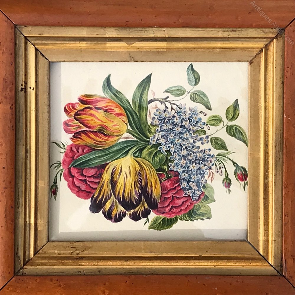 A most attractive 19th century watercolour of garden flowers including parrot tulips, roses and lilac. The painting, which is indistinctly signed but by a competent hand, is surrounded by a gilt slip and maple frame.