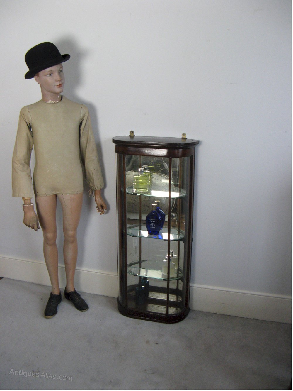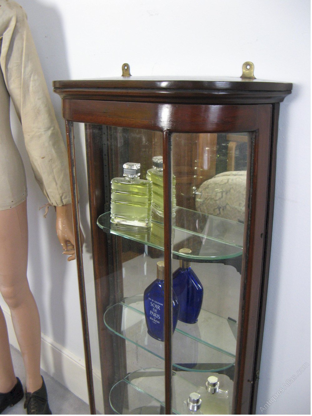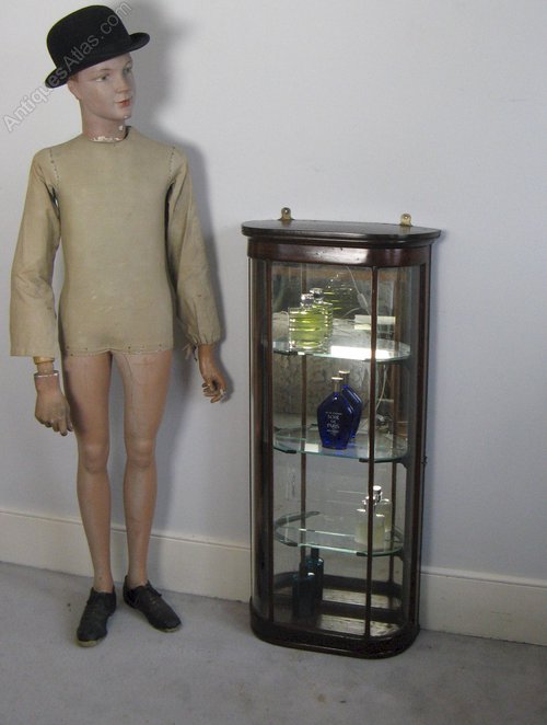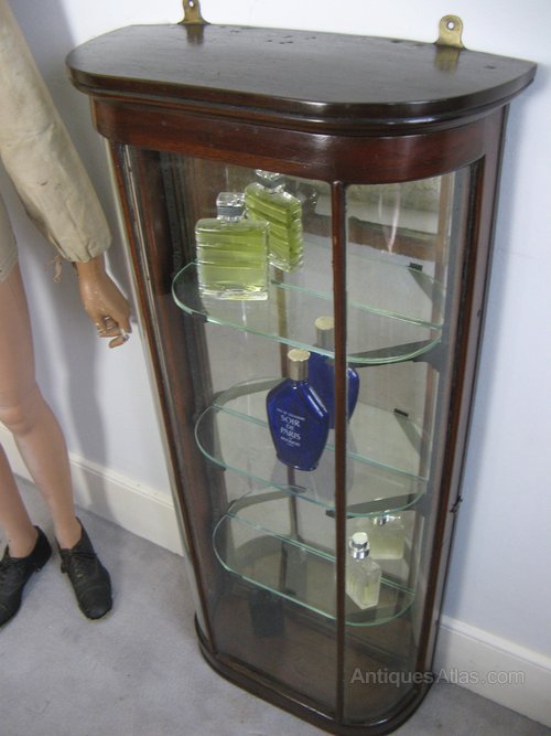 Victorian bow fronted mahogany shop display cabinet . Great for perfume bottles. Measures 42.5 in high x 19.5 in wide x 8 in deep