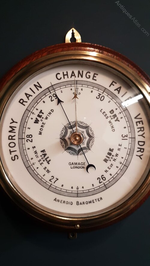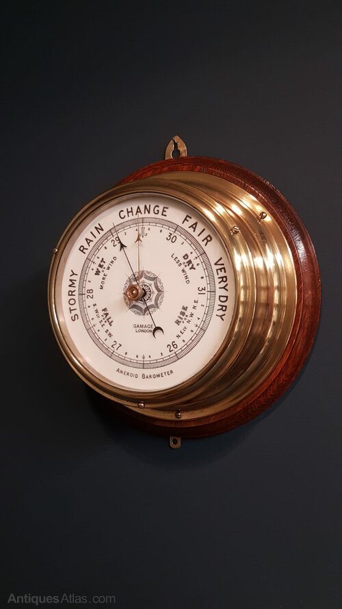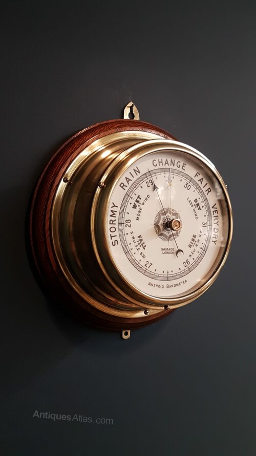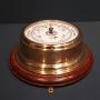 A Victorian brass cased ships bulk head marine barometer with porcelain dial by Gamage of London c.1885. The deep polished brass case mounted on a turned English oak plinth with securing fitting to the top and base. Rapid indicating aneroid movement sat behind a white porcelain dial with quarter plate glass set in a cast brass bezel and centre reading marker. Bears the makers name 'Gamage London'. Fully serviced and working, presented in excellent condition with a deep shine. Measures 10.5" diameter x 3.5" deep.