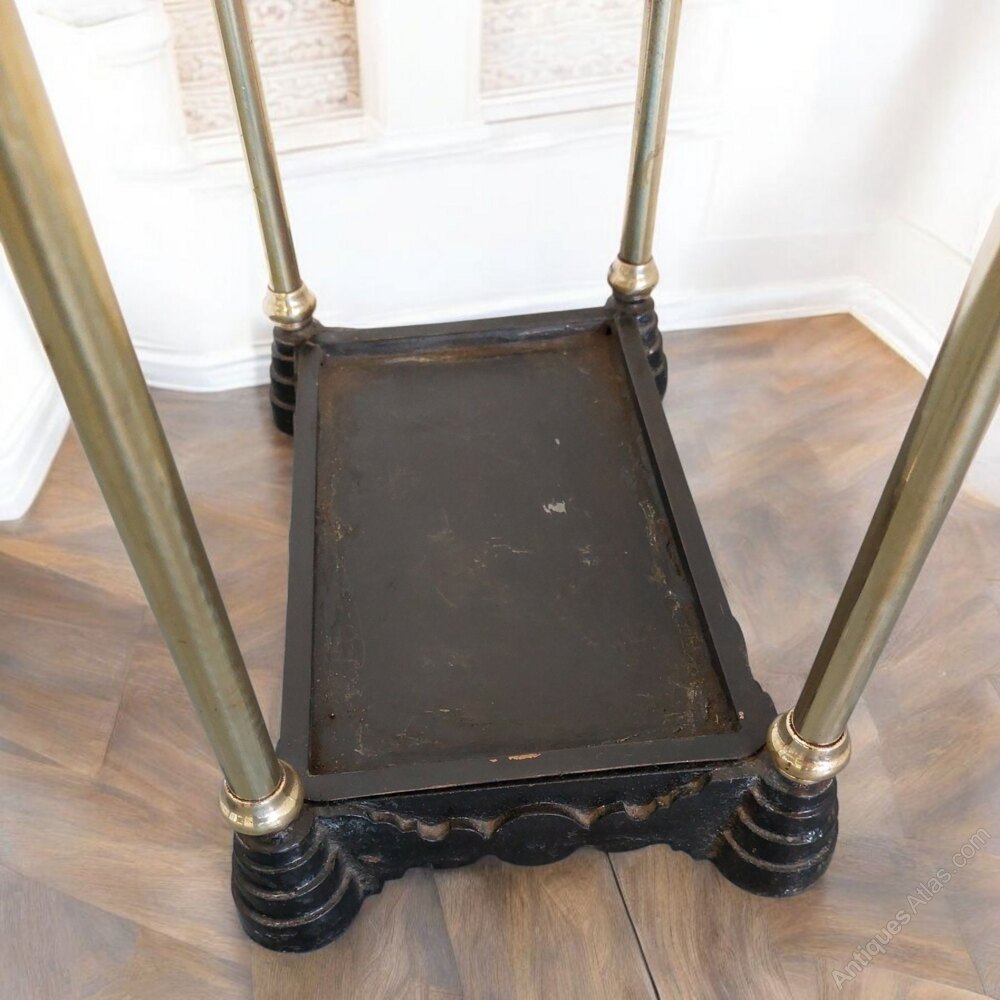 A late 19th century brass and cast iron stick/umbrella stand of fall front design. The stand has been professionally polished to a deep shine and is ready to use. Presented in superb condition with six compartments for your walking sticks or umbrellas.
