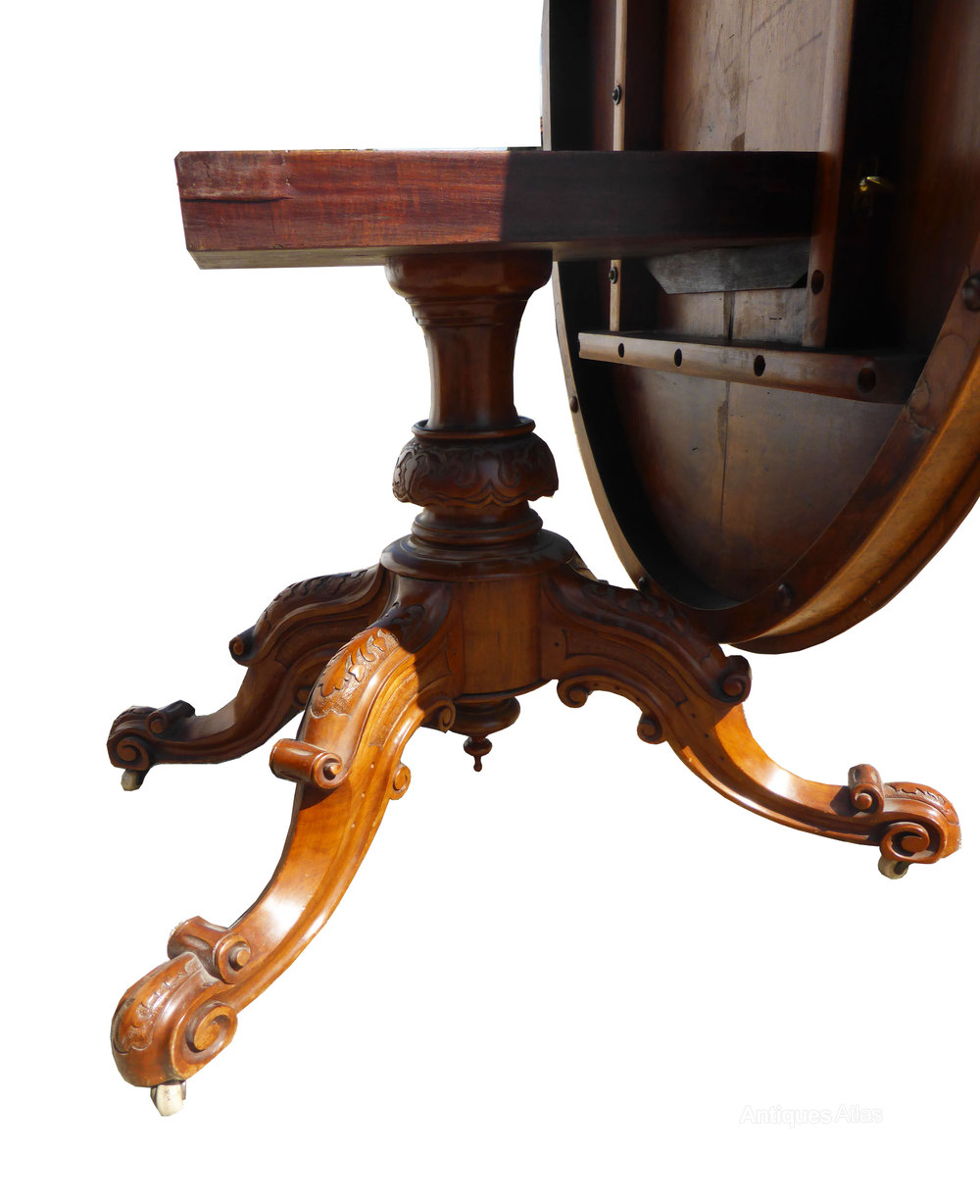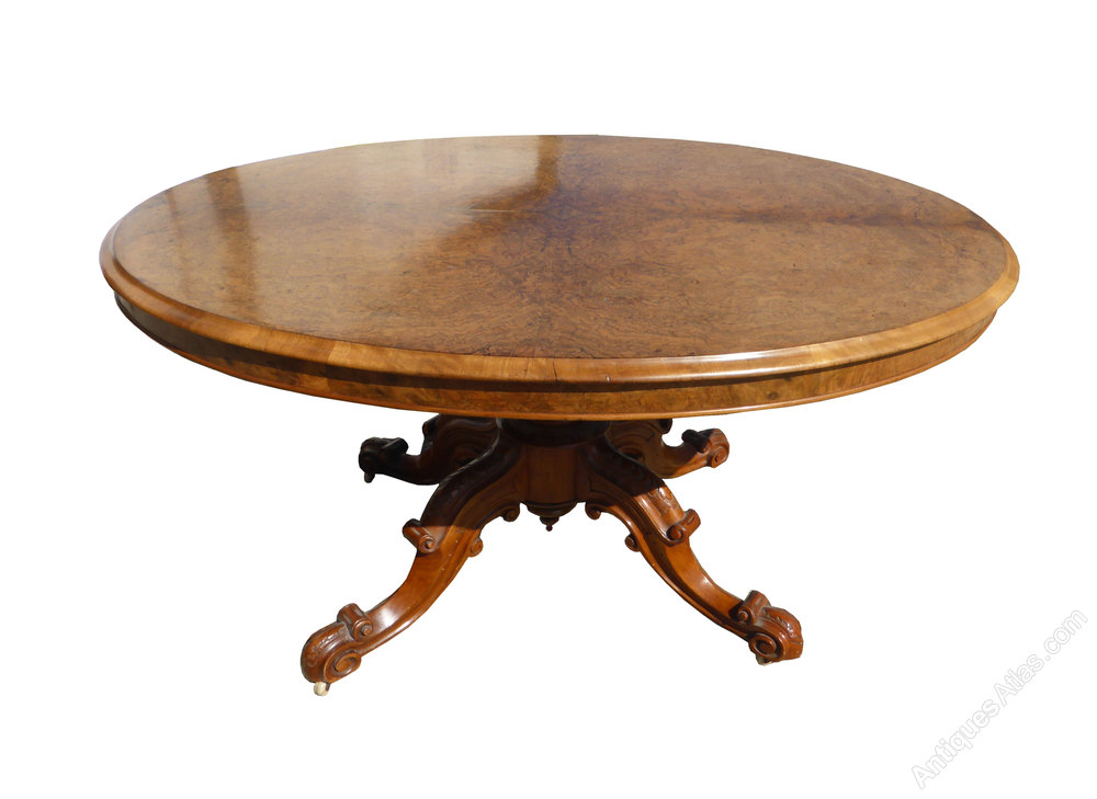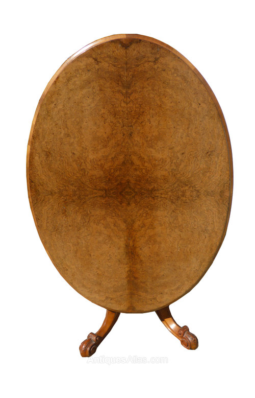 For sale is a good quality Victorian Burr Walnut Breakfast Table . The top of the table tilts, making it a practical item for when the table is not in use. The table has a nicely carved base which terminates with four carved cabriole legs.
