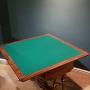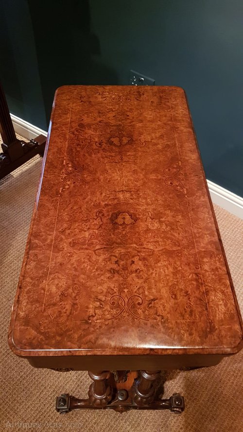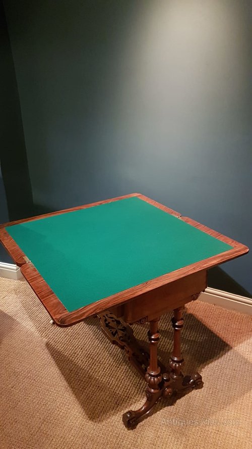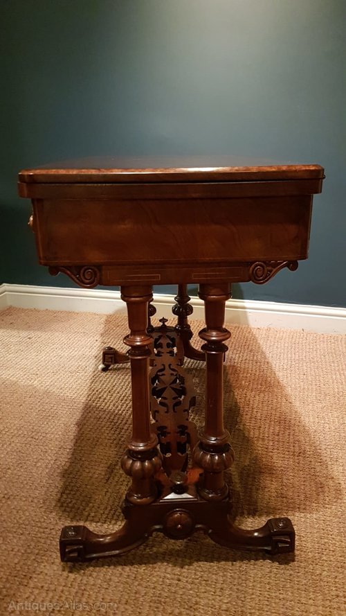 A superior quality mid Victorian burr walnut fold over gaming table with three drawers and decorative base c.1875. The oblong top with book matched burr veneers and decorative fruitwood stringing. Three drawers to the front apron with matching stringing and original turned knobs. Turned and carved column supports to the sides with splayed feet. Central stretched with fretted decoration. The top opening and folding over to reveal a green cotton baized interior forming a gaming table. Presented in immaculate condition with a deep shine. Measures 36" long x 18" deep x 28" high. Stock number 37032.