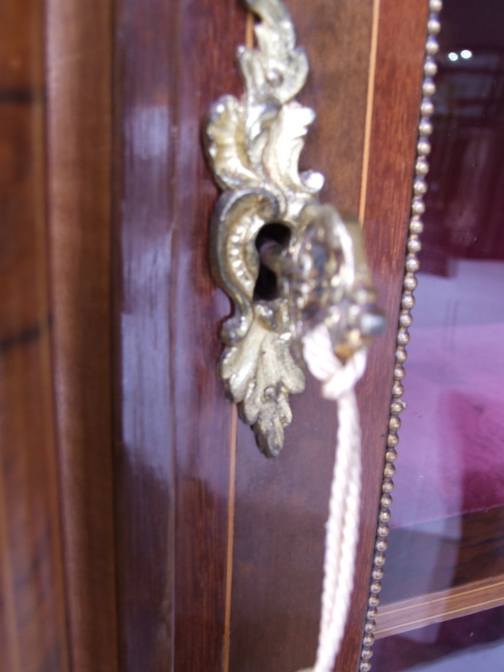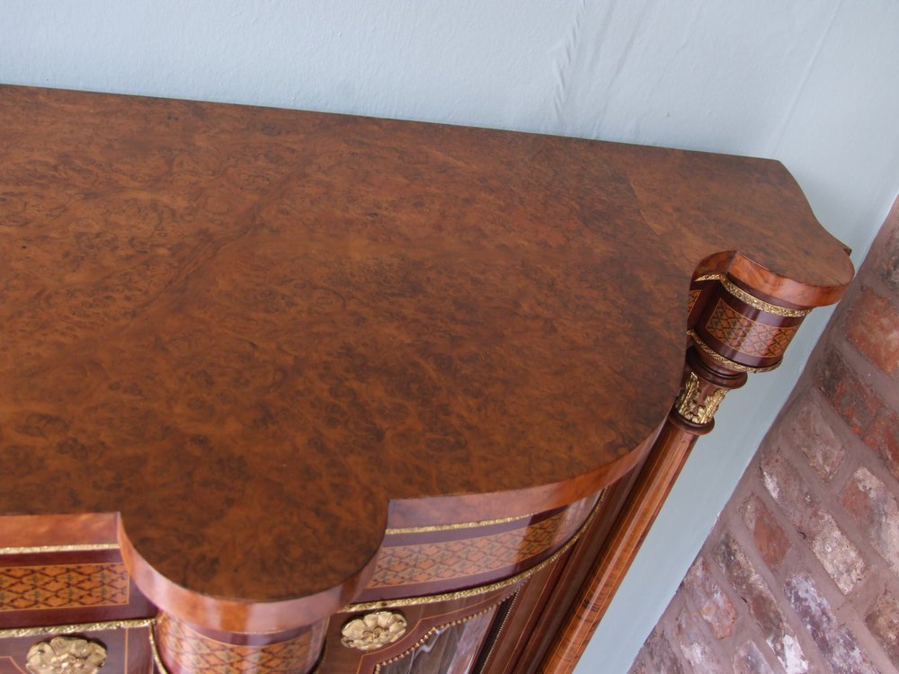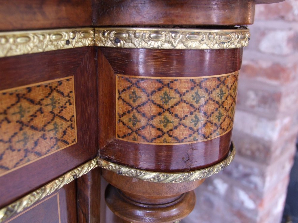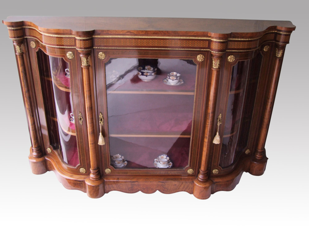 Victorian burr walnut and mahogany credenza of serpentine form with satinwood, ebony, boxwood and dyed sycamore inlays decorated with ormalu mounts and rosettes