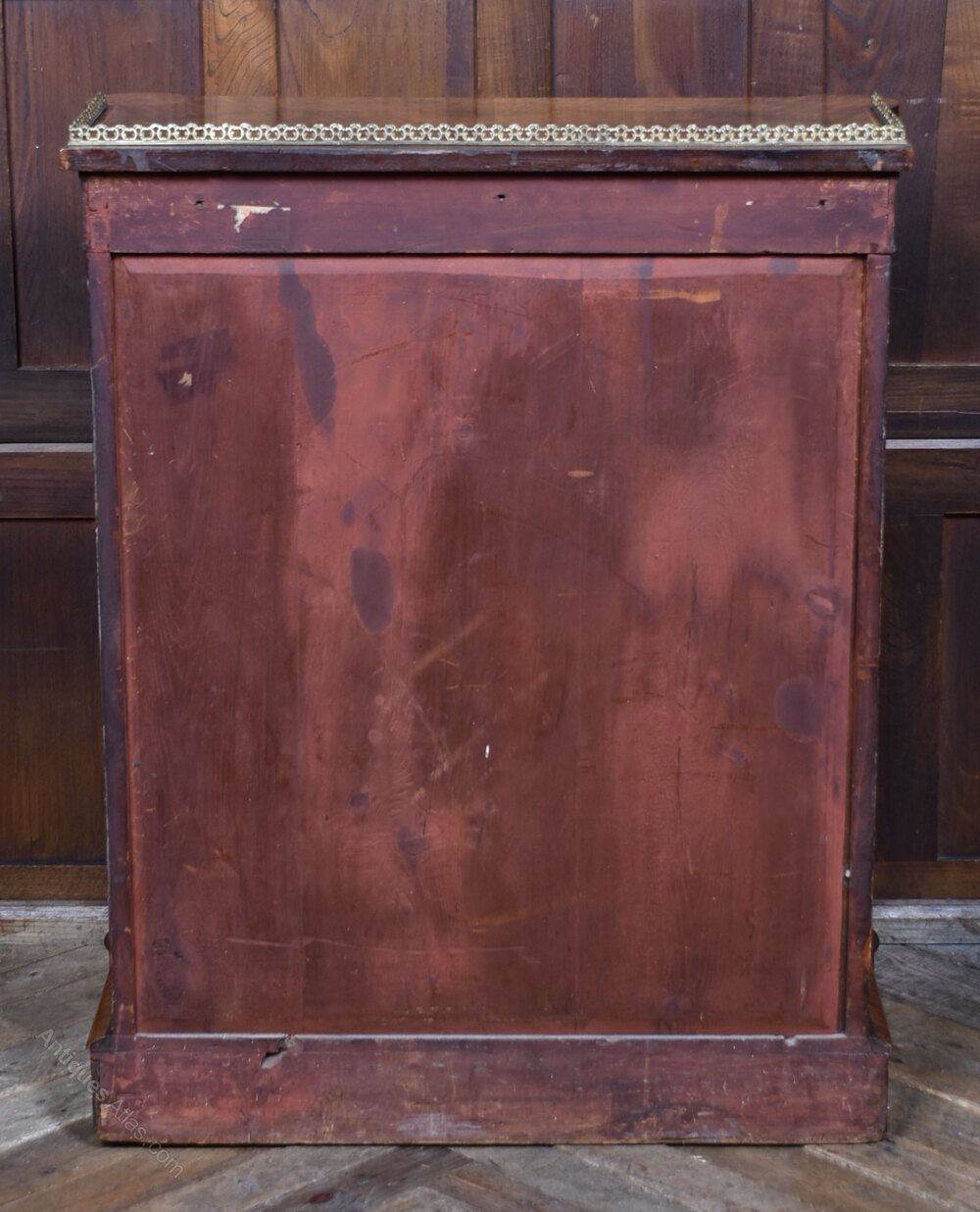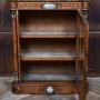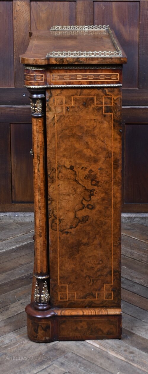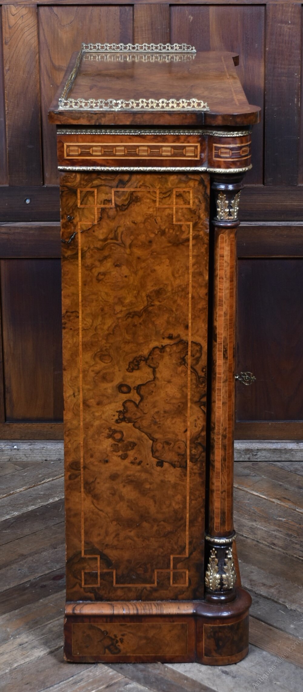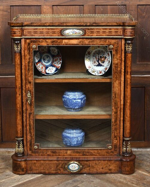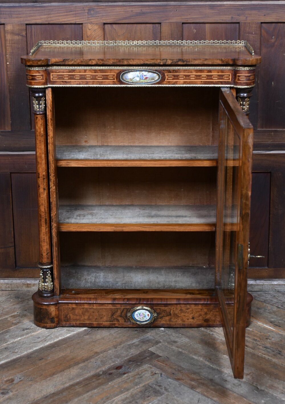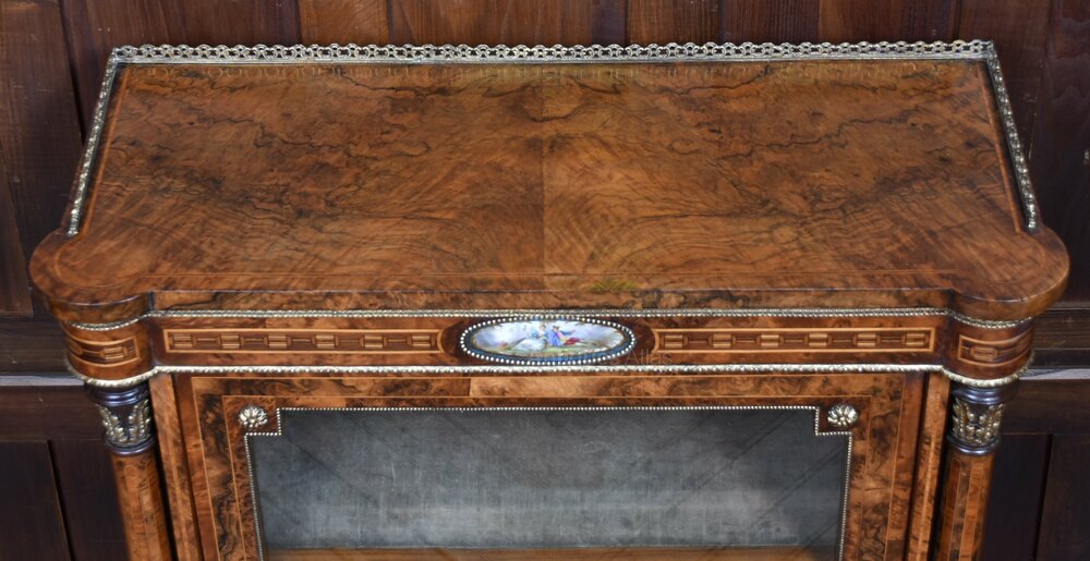 An exceptional pier cabinet crafted from richly figured burr walnut, its surface displaying superbly patterned veneers that highlight the natural beauty of the wood. The cabinet is adorned with refined ormolu mounts and decorative inlays. The top is finished with a pierced brass gallery, while the frieze is embellished with Sevres-style porcelain plaques and delicate string inlay. The glazed door retains its original lock and key and opens to reveal two fixed shelves lined with velvet, edged in walnut. Presented in excellent antique condition, with only light surface marks consistent with age, this graceful cabinet combines practicality with decorative appeal. Its warm patina, intricate detailing, and refined proportions make it a striking statement piece, ideal for enhancing a study, drawing room, or collector’s interior.