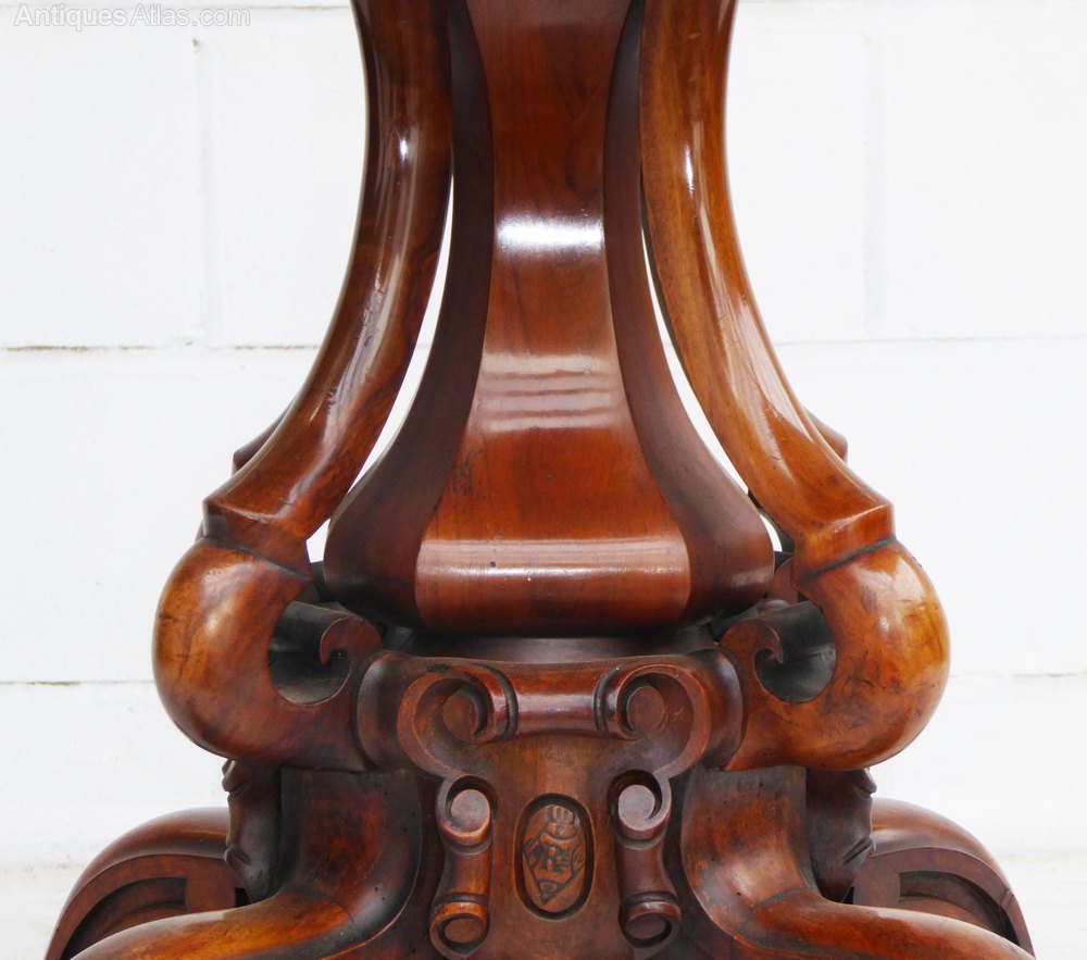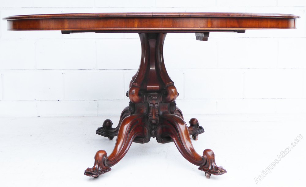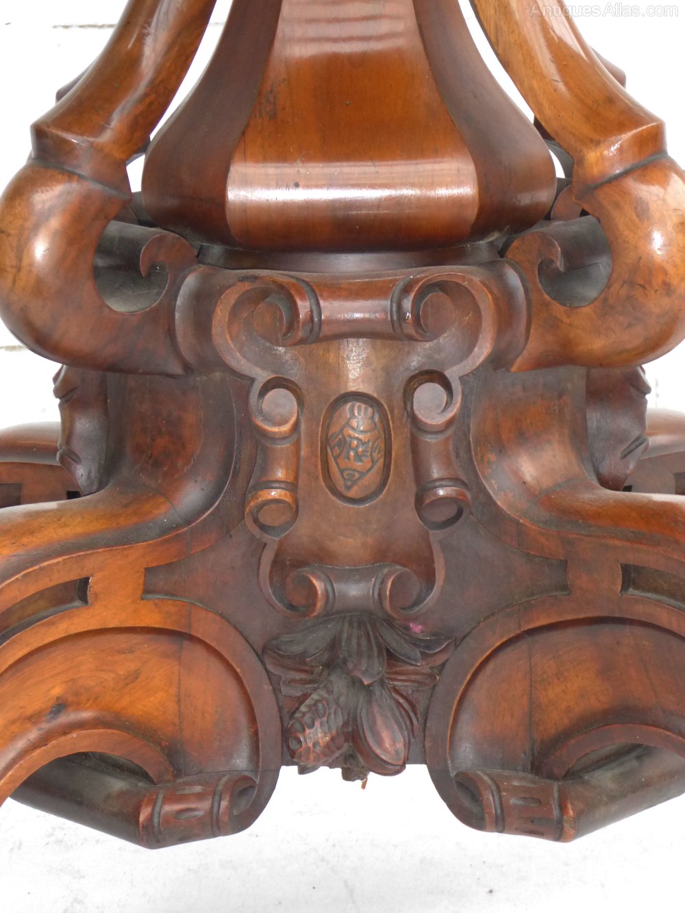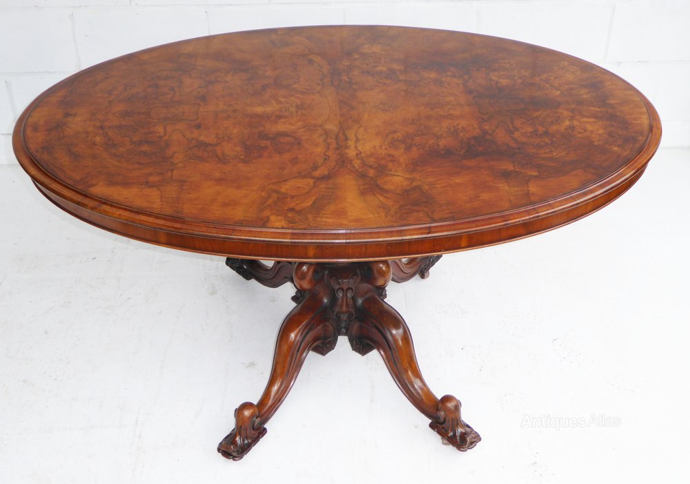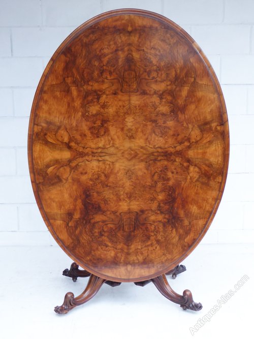For sale is a good quality Victorian Burr Walnut Oval Breakfast Table. The table top fits onto an ornate carved base base, standing on nicely carved and shaped legs terminating on scroll feet. This piece is in very good condition having been fully restored and re-polished by hand. This table has a brass registration mark on the top of the base, and another carved into the front of the base. The registration mark tells us that the table was made on the 14th of December 1847, and is number 64.