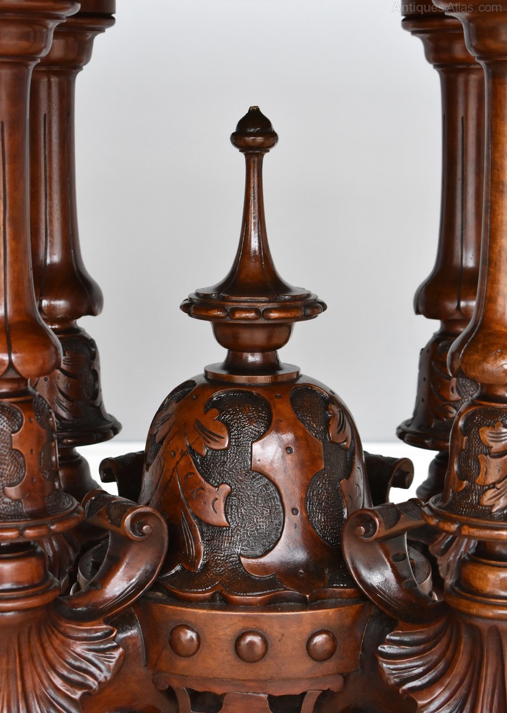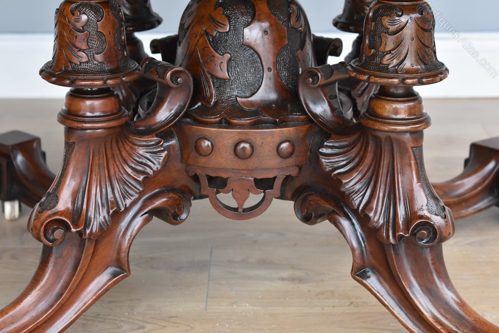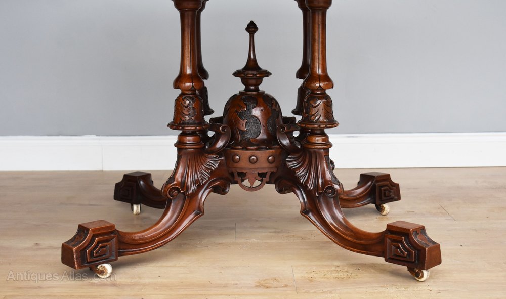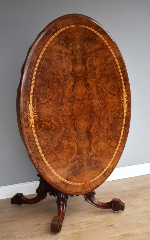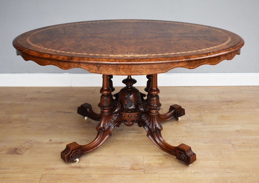 For sale is a good quality Victorian Burr Walnut Breakfast Table, having a well figured top with fine inlays to the edge. Below this, the table has a superbly carved birdcage base, with ornately columns, central finial and fine decorative carvings. Overall, the table is in very good condition for its age.