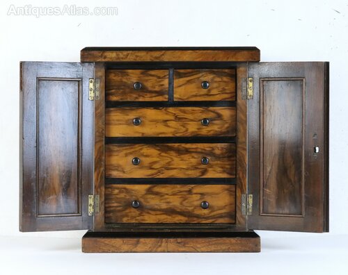 A very attractive Victorian tabletop or miniature cabinet in burr walnut with a fine patina and warm colour, circa 1870. The panelled doors open to reveal two short and three long drawers with ebonised knob handles. It would have been used for jewellery or collector's items or similar.