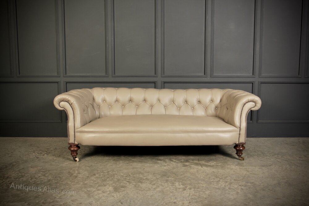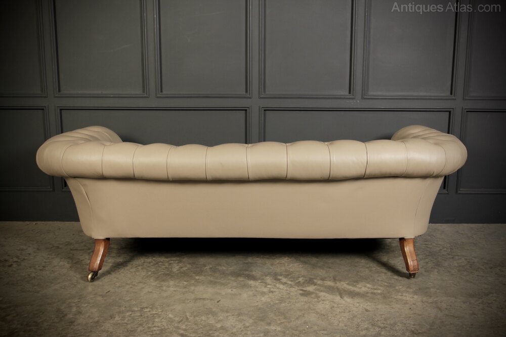 A classic piece of British craftsmanship, this genuine Victorian Chesterfield sofa combines timeless design with superb comfort. Featuring a deep buttoned backrest and elegant scroll-over top. The smooth, spacious seat is upholstered in a high-quality taupe leather, soft yet durable, and finished with a brass-studded trim.