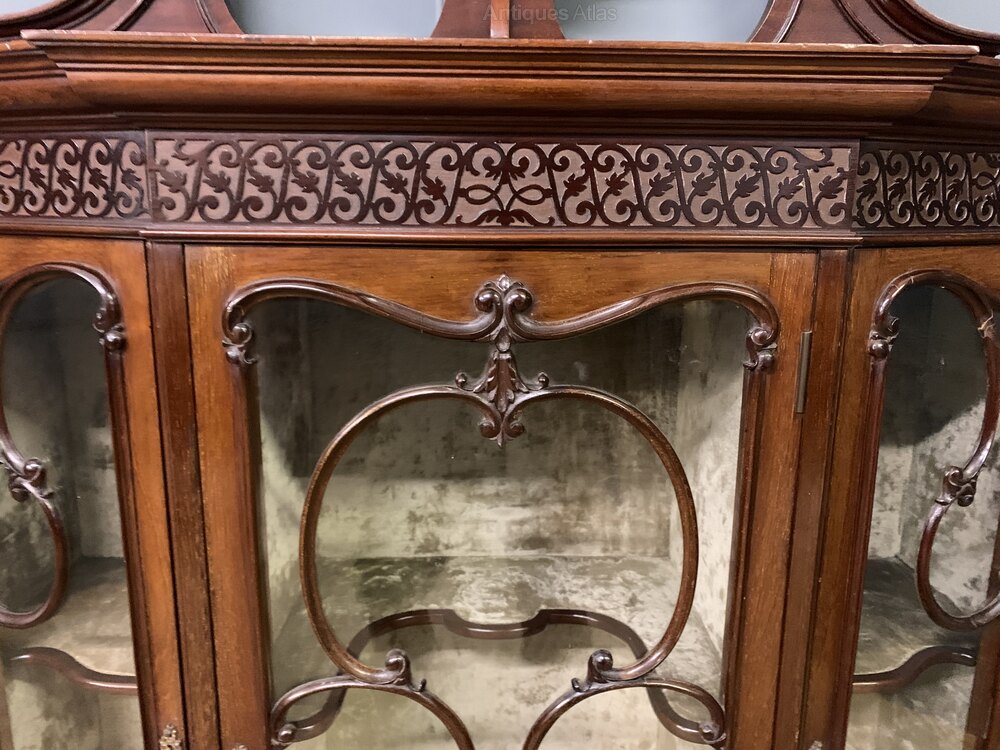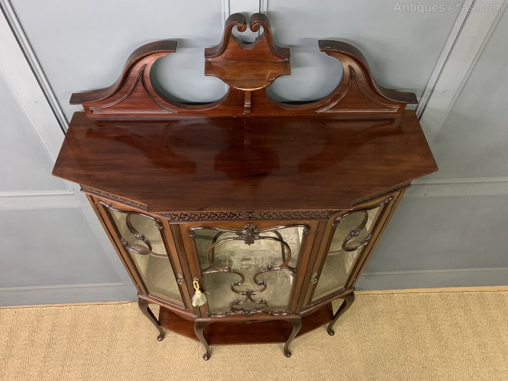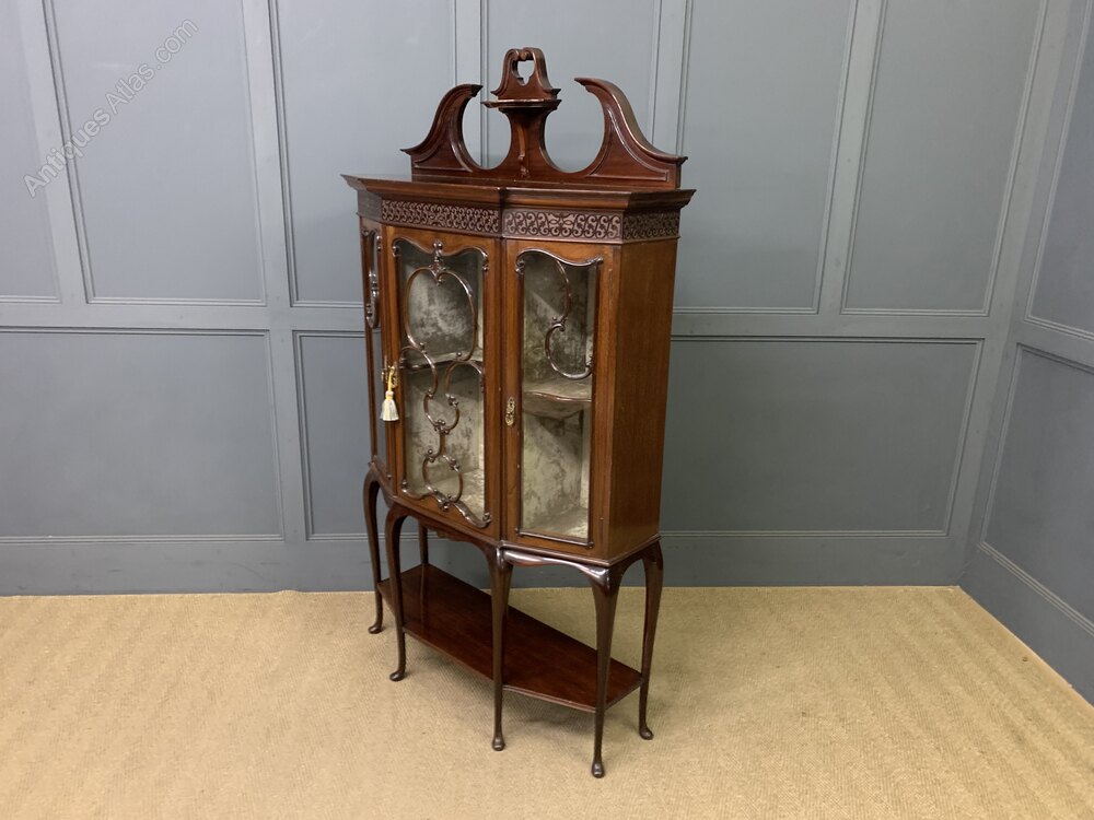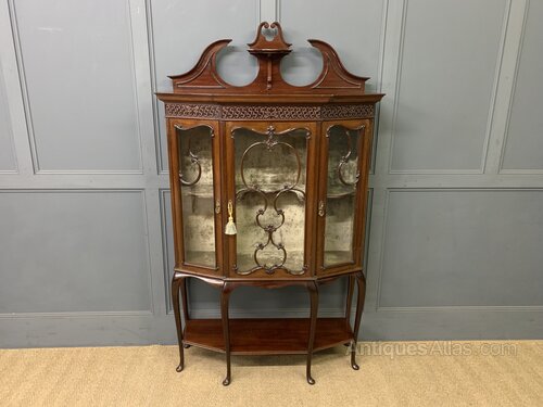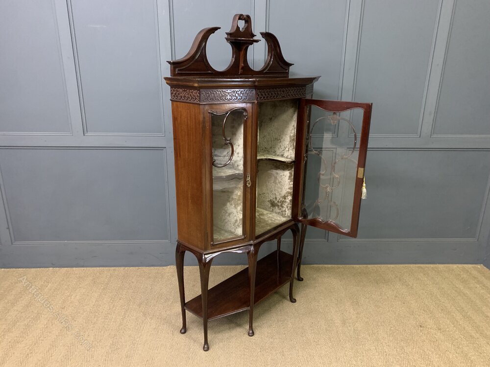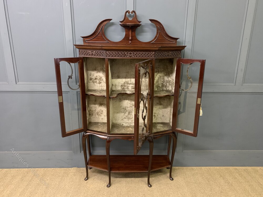 An ornate late Victorian period mahogany display cabinet. Well constructed in solid mahogany in the rococo style. Surmounted by a broken-arch pediment with a blind fret-work freeze beneath. With 3 glazed, opening doors (all lockable, key supplied). The doors open to access shelved display space lined in original light green velvet material. All standing on elongated cabriole legs which are united by an under-tier. Offered for sale in very good original condition, ready to go straight into the home.
