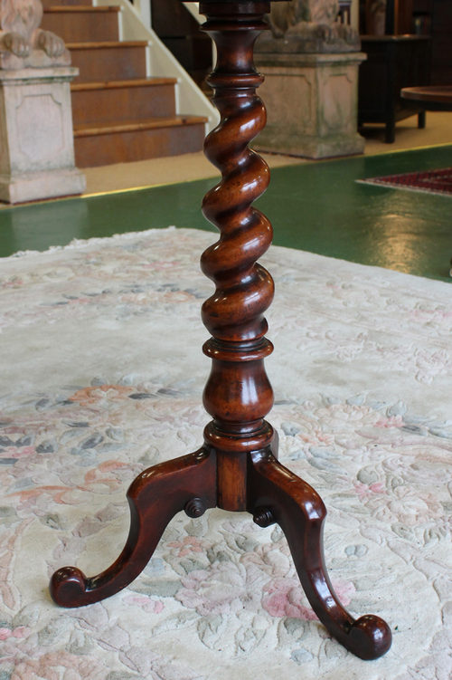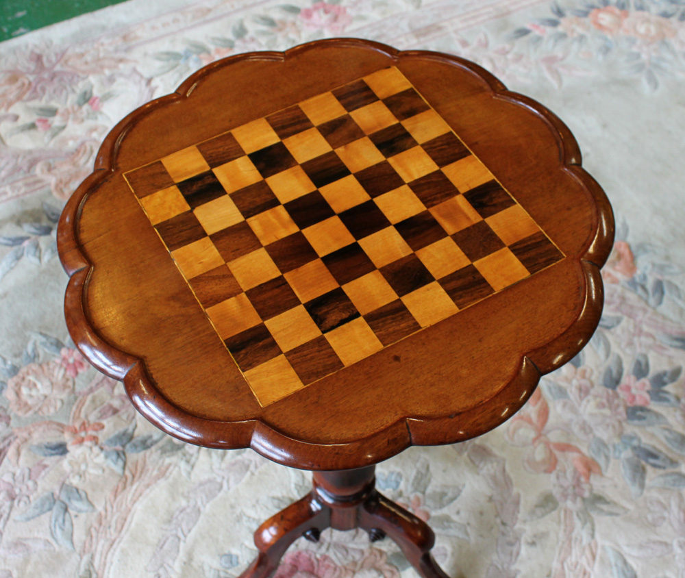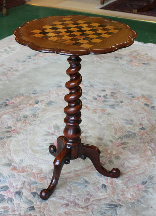 A delightful little Victorian mahogany occasional table with original chess board top c.1860. Shaped top, superb carved barley twist stem and a neat tripod base. The chequer board is made of inlaid squares of satinwood and rosewood.