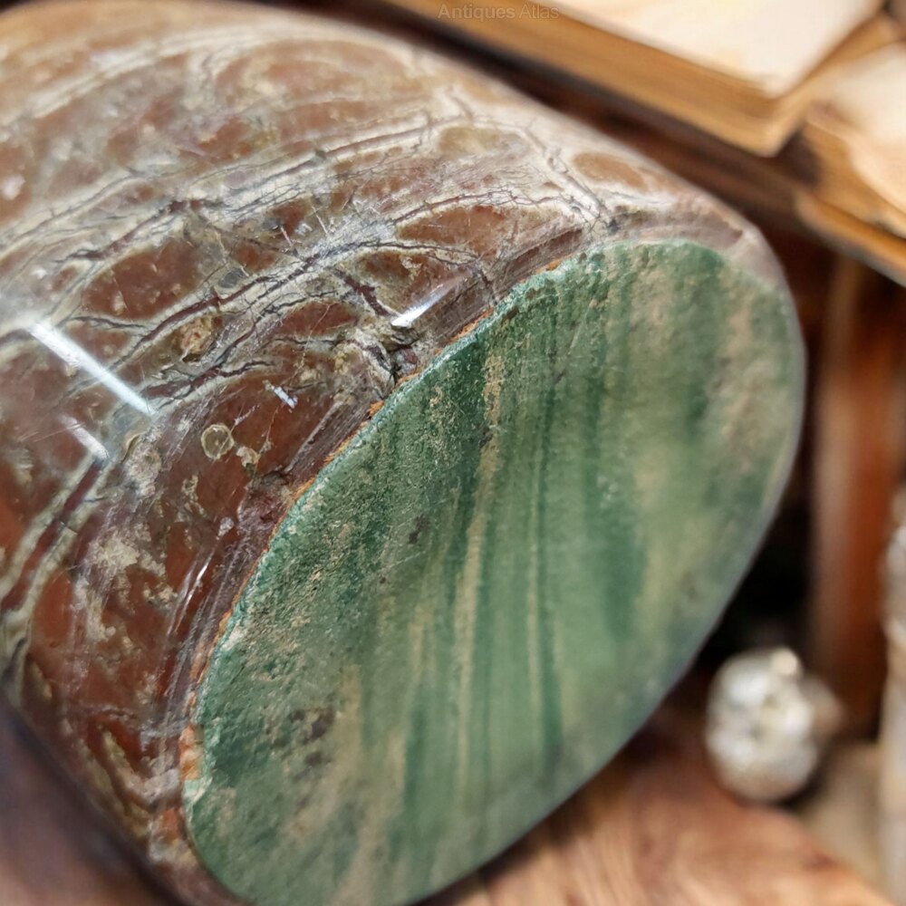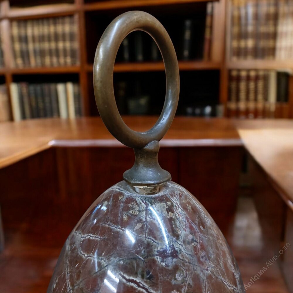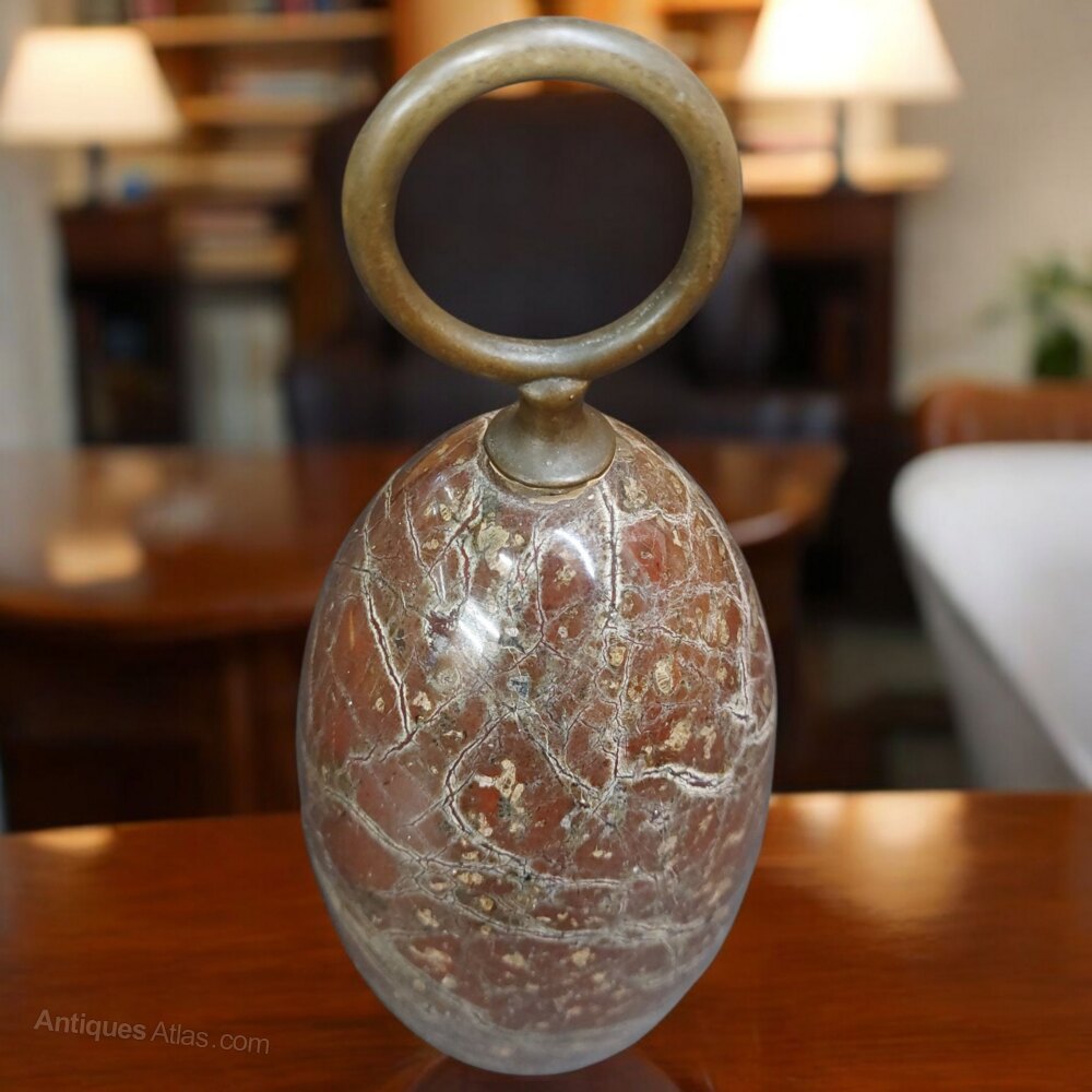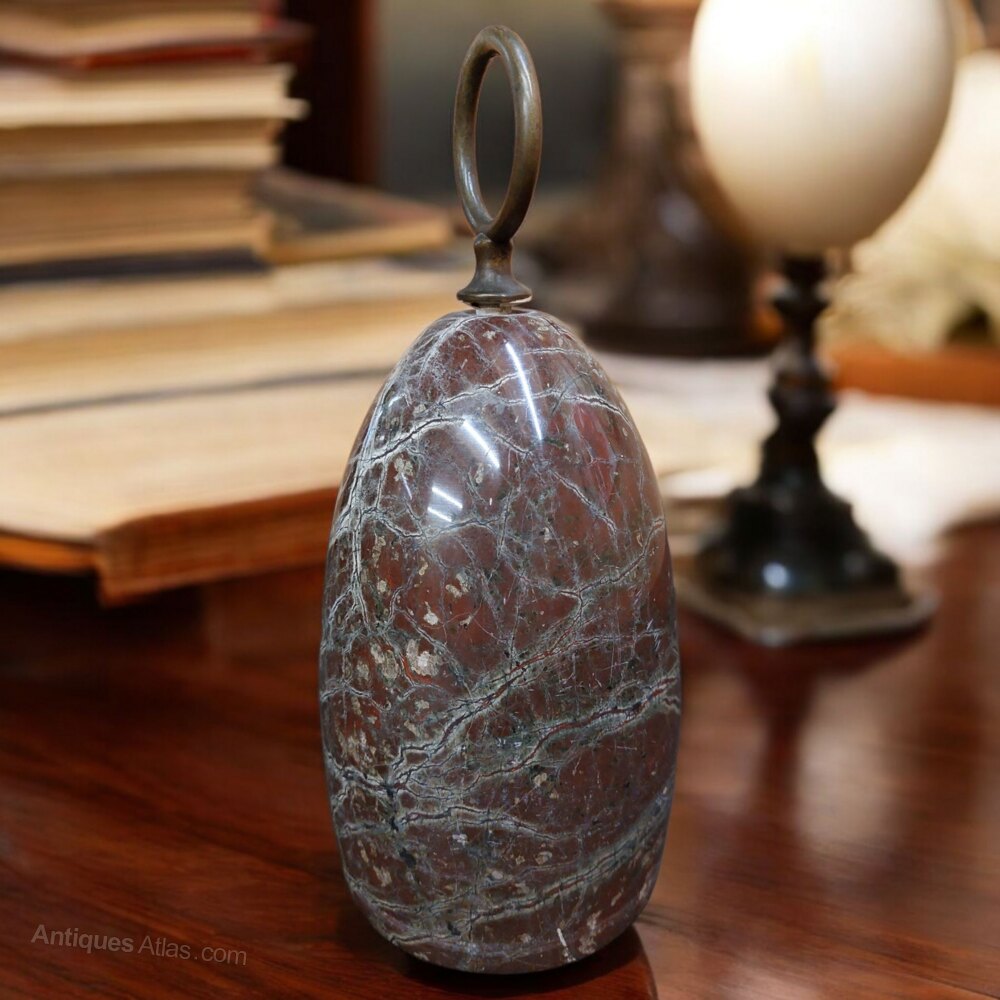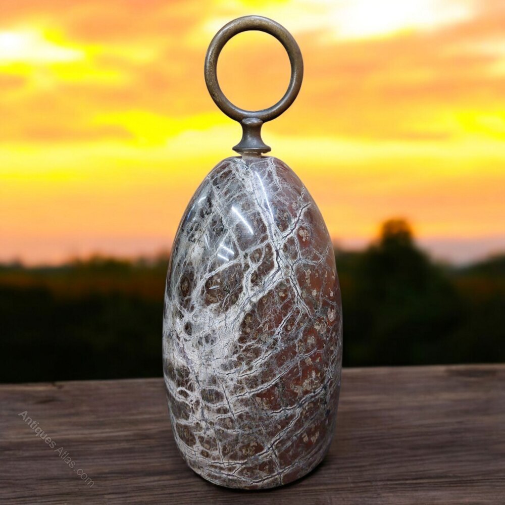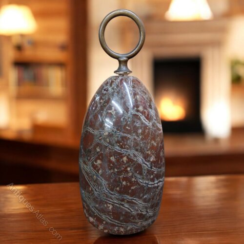 A fine quality Victorian Cornish serpentine marble doorstop/porter. (made on the Cornish Peninsula) The solid piece of serpentine marble is an ovoid shape with a brass ring handle. The handle sits slightly proud where it is inserted into the marble. One very small nibble on the base as seen in photo. Probably one of the best veined and coloured piece of serpentine I have handled. Weight 3.1 kilos. 9 3/4" tall x 4" diameter base. Very hard to find in this condition. All original.