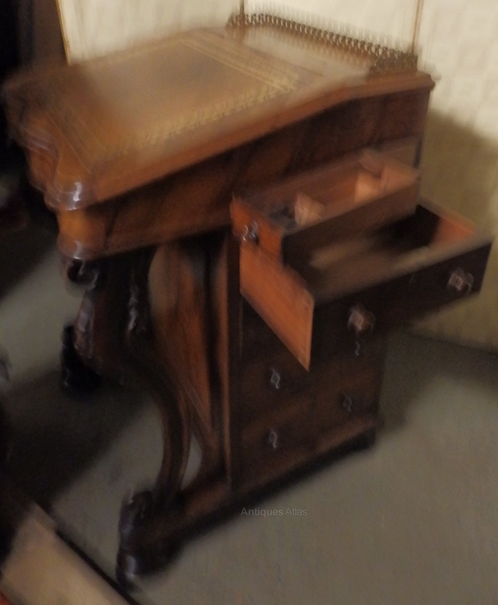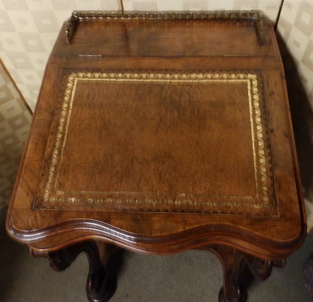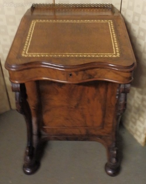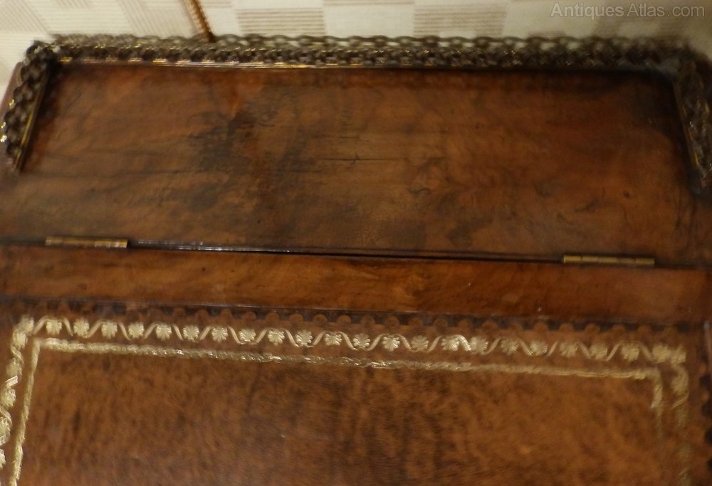 no-230-1870 burr/walnut davenport with brass gallery and new leather insert (slight water damage on the very top part )otherwise in nice condition