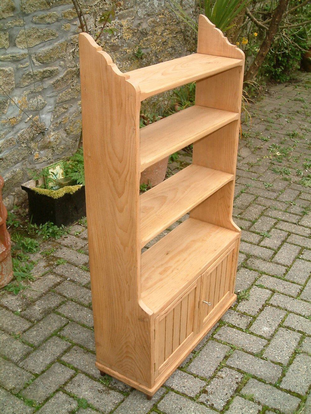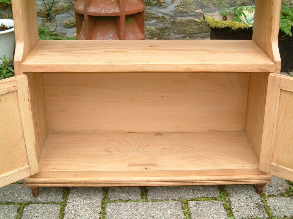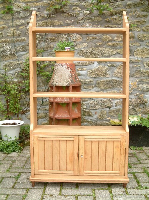 A small Arts & Crafts, Victorian pine display shelves, with lower cupboard, on small turned feet. Could also be used as a small bookcase. The cupboard compartment is enclosed by two doors with elbow catch and lock and key fastening.