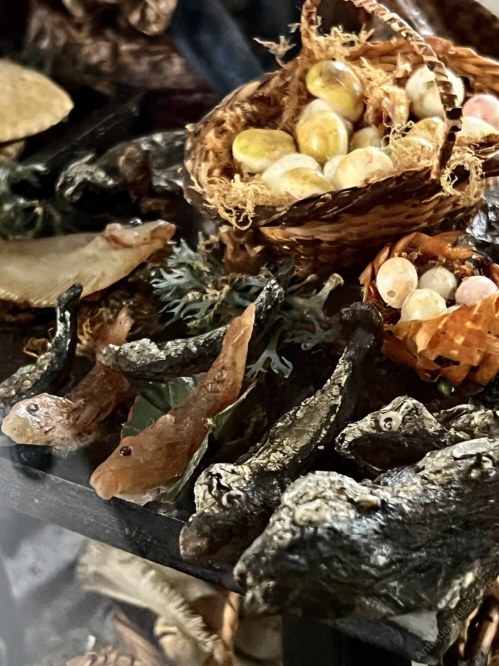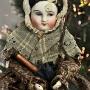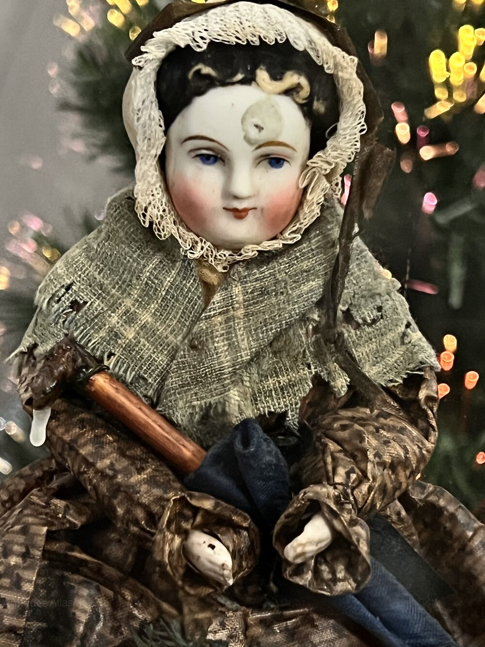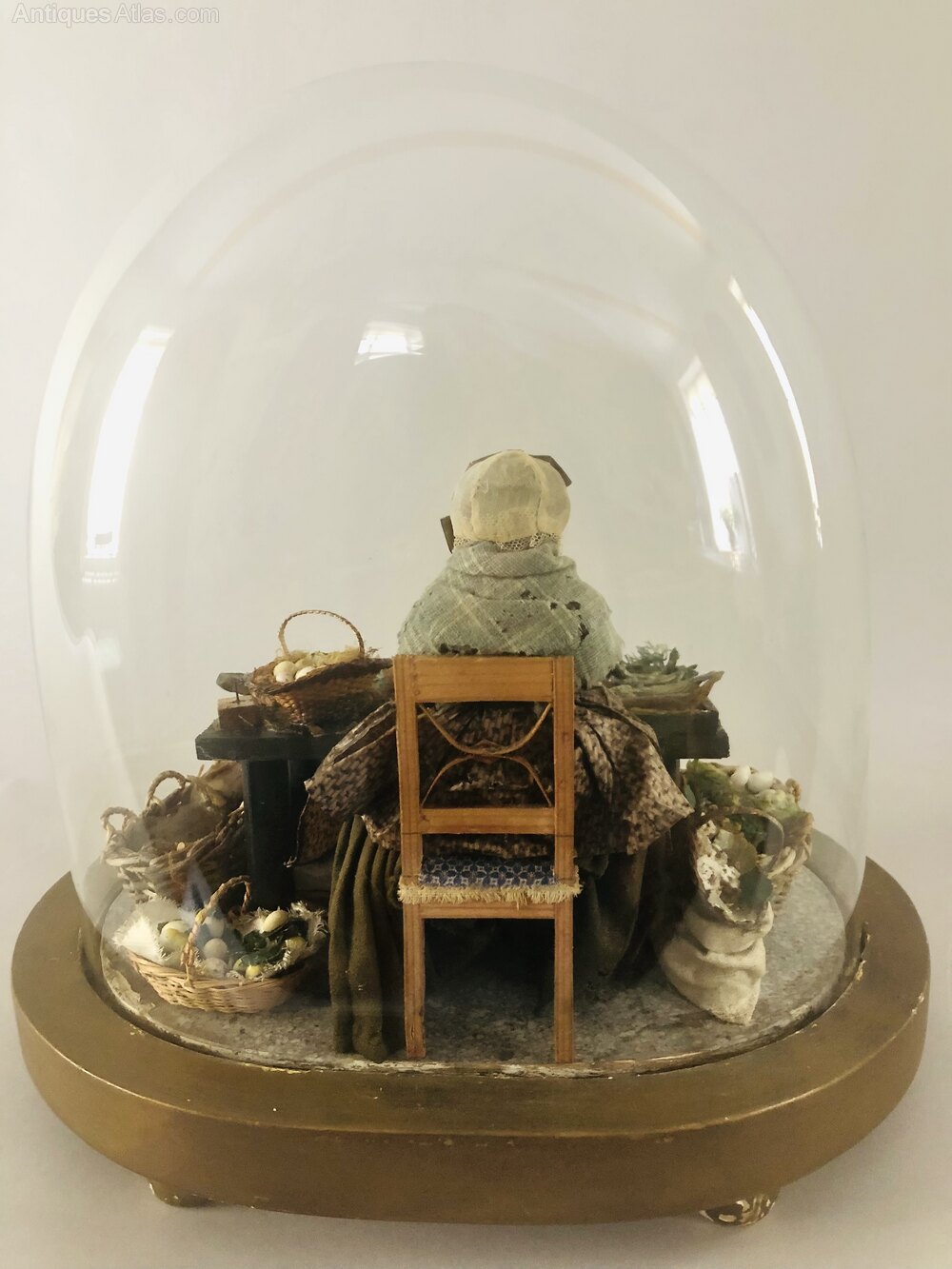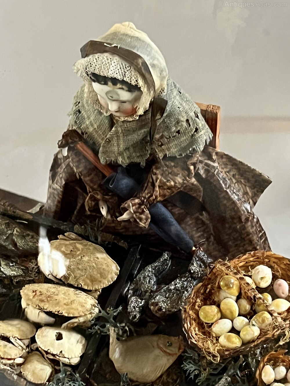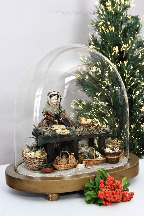 Impressive example of the late 19th century Pedlar Doll. Under the glass dome, set into an oval gold painted stand, is a Fish Seller with her wares. Dressed against the cold and holding an umbrella, she has a vibrant painted face. Her extensive sea food is laid out in trays and baskets some are made up of tiny shells. A lovely piece of folk art, beautifully presented, standing on gold bun feet, and in very good condition. Circa 1880