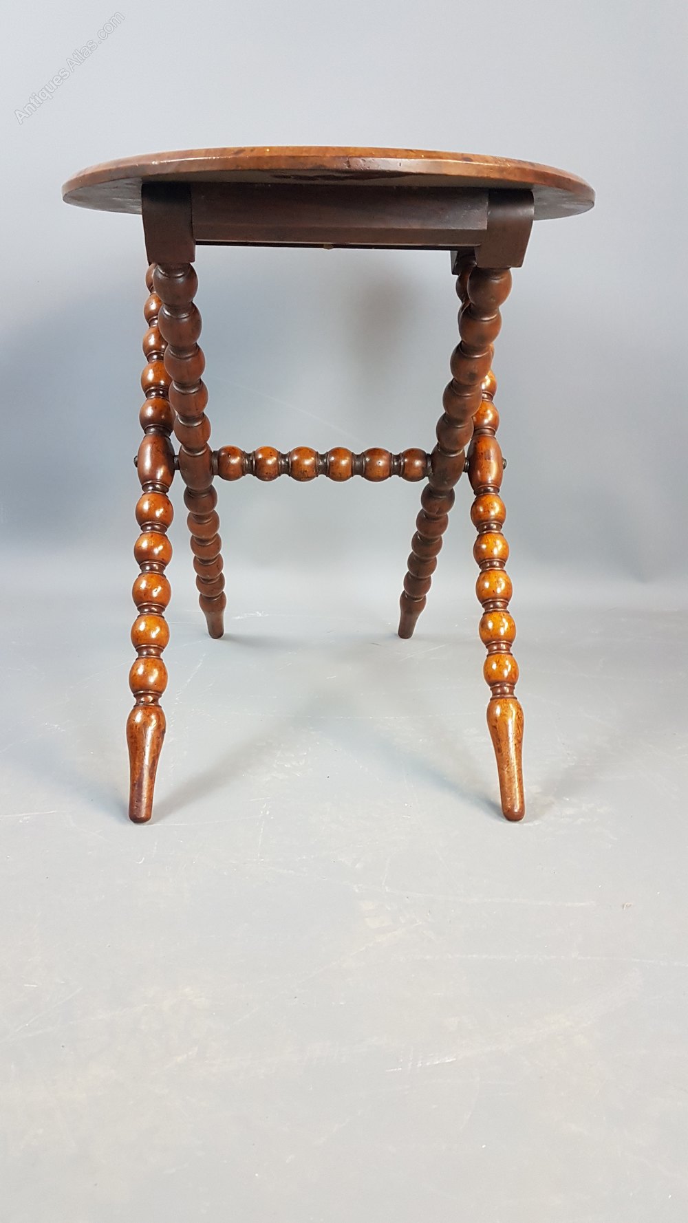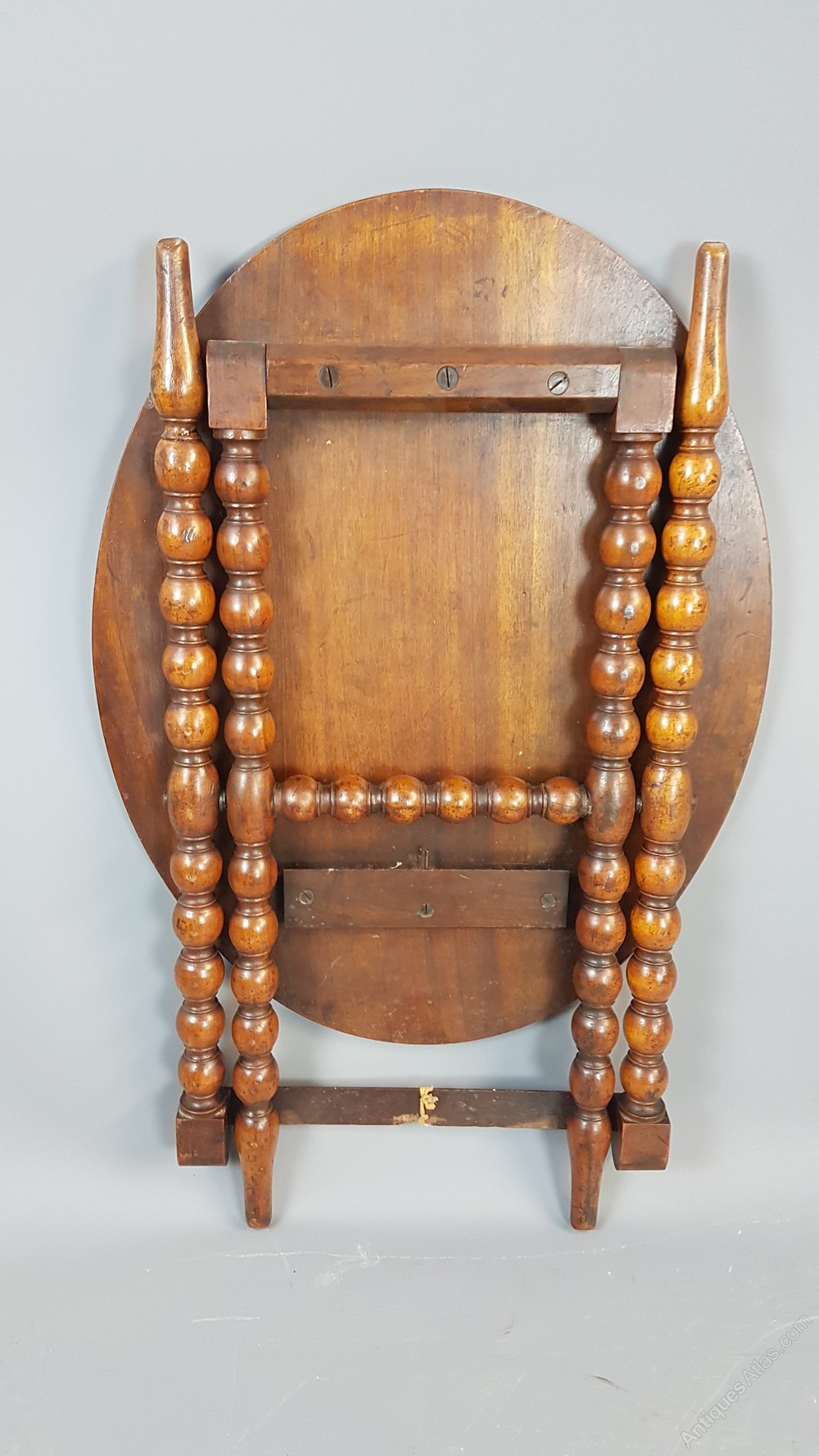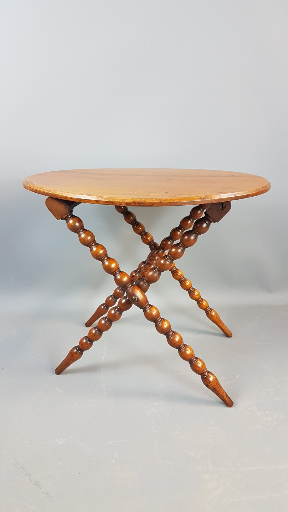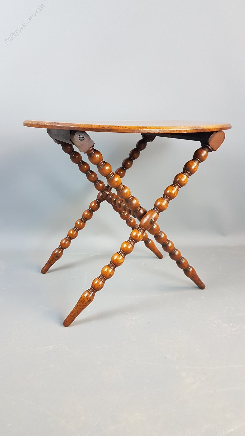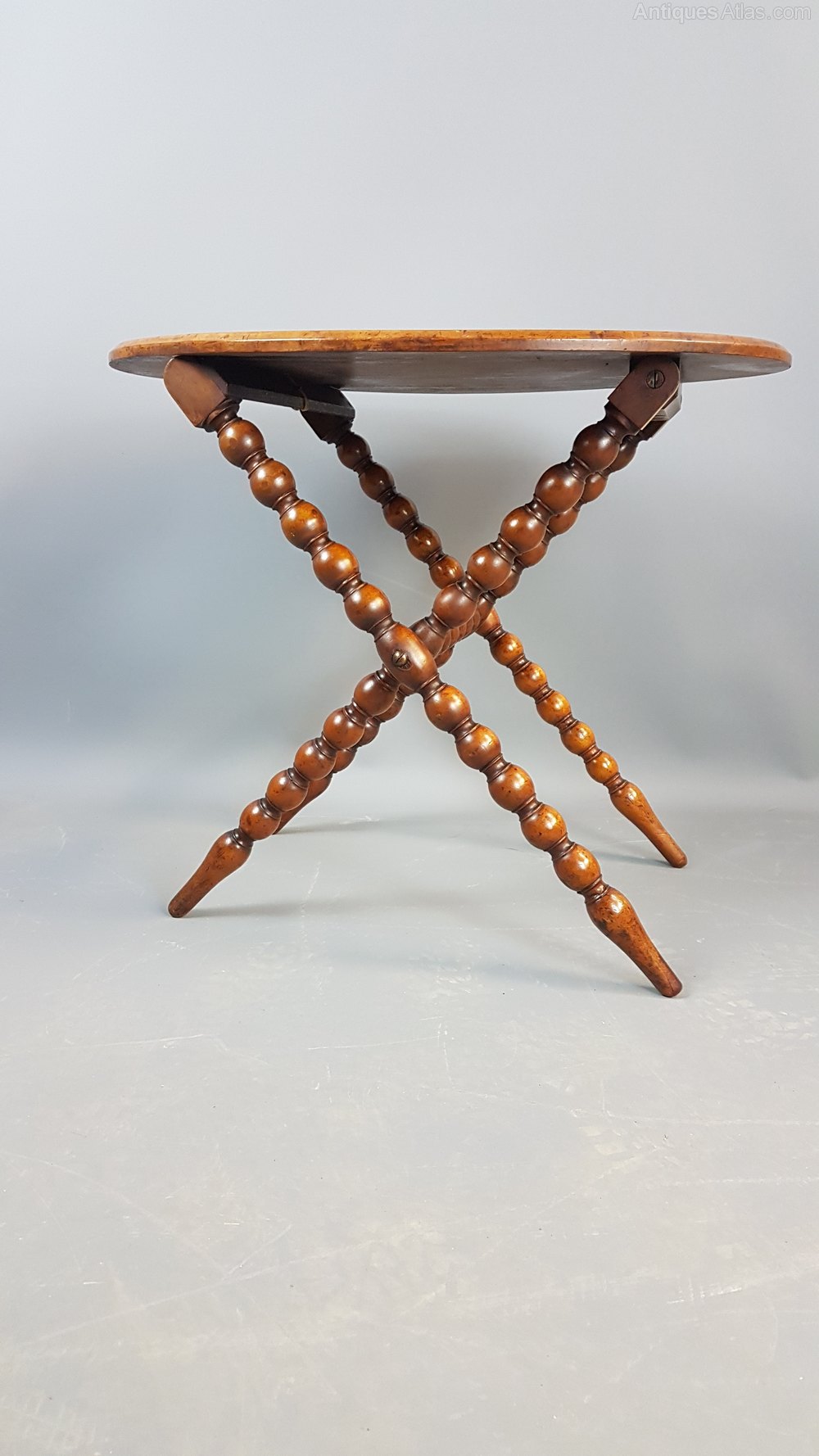 Charming Victorian walnut folding table with bobbin turned legs and cross stretcher. When up it is nice and stable but folds up flat with ease. Polish is in good order and measures 52cm high by 47cm deep and 61cm wide.