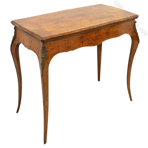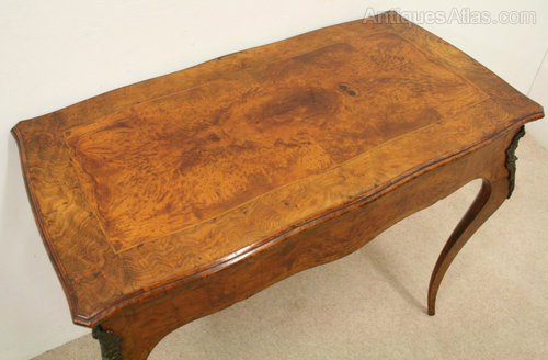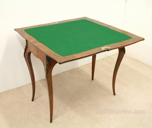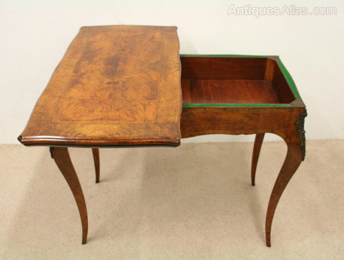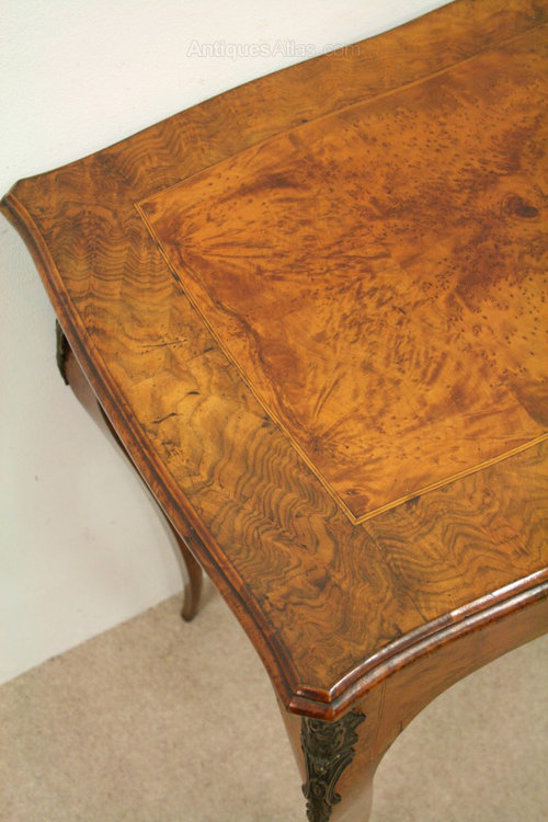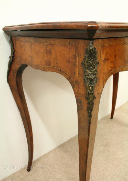 Circa 1880, beautiful Victorian walnut, burr walnut, burr yew and inlaid foldover card table. The rectangular top has shaped sides and canted corners. The centre is a beautifully quarter veneered amboyna with string inlay and walnut banding. The top is hinged and opens to reveal a felt lined interior, with wonderful cast brass hinges and lovely figured walnut. Below the top, the apron is shaped on all sides and crossbanded. The whole piece stands on 4 cabriole legs with bronze mounts on the top and finishing on elegant feet.