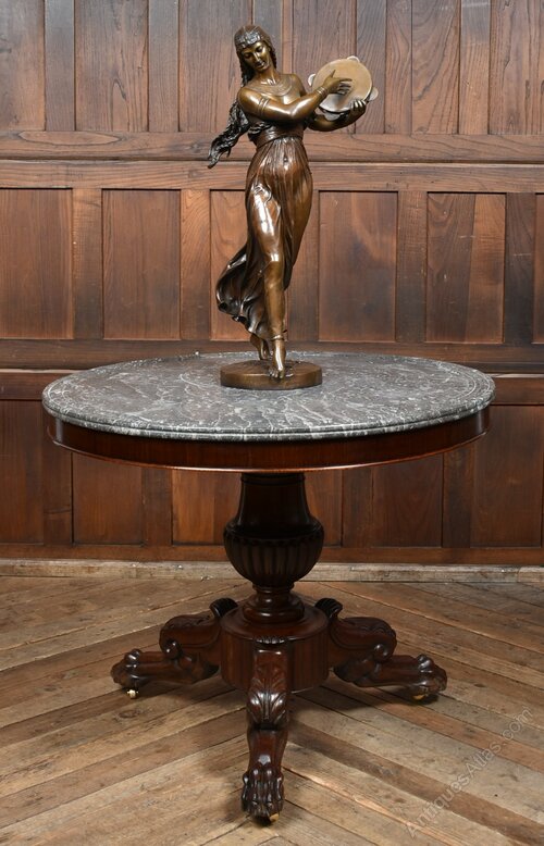 An exceptional French gueridon from the 19th century, presented in superb condition and showcasing the elegance of period craftsmanship. The circular black and white marble top features a wide moulded edge and concentric rings, intended to prevent spills from running over the sides. The marble rests upon a boldly carved, bulbous central column, which rises from a finely sculpted tri-form base adorned with acanthus scrolls and terminating in robust paw feet, each set on original brass castors. The wood retains a rich, polished patina that beautifully offsets the cool refinement of the marble. Both decorative and functional, this piece offering timeless sophistication to any home.