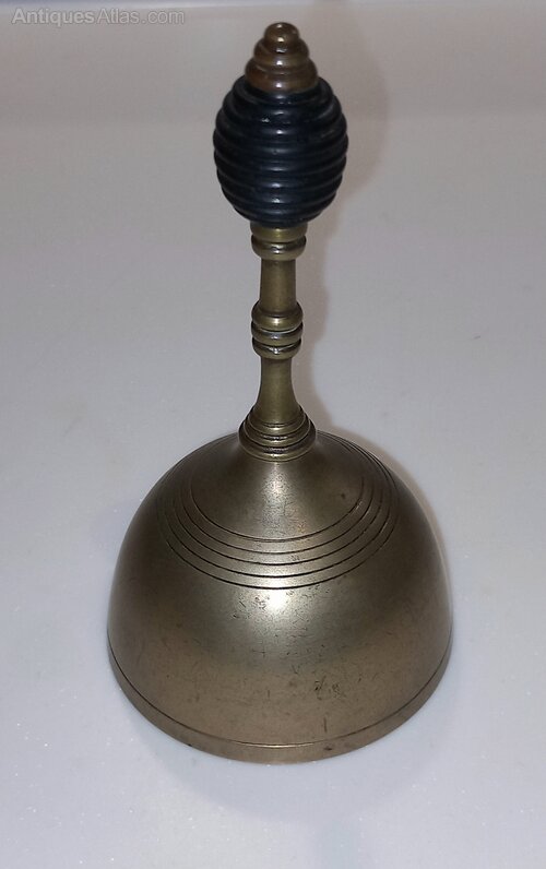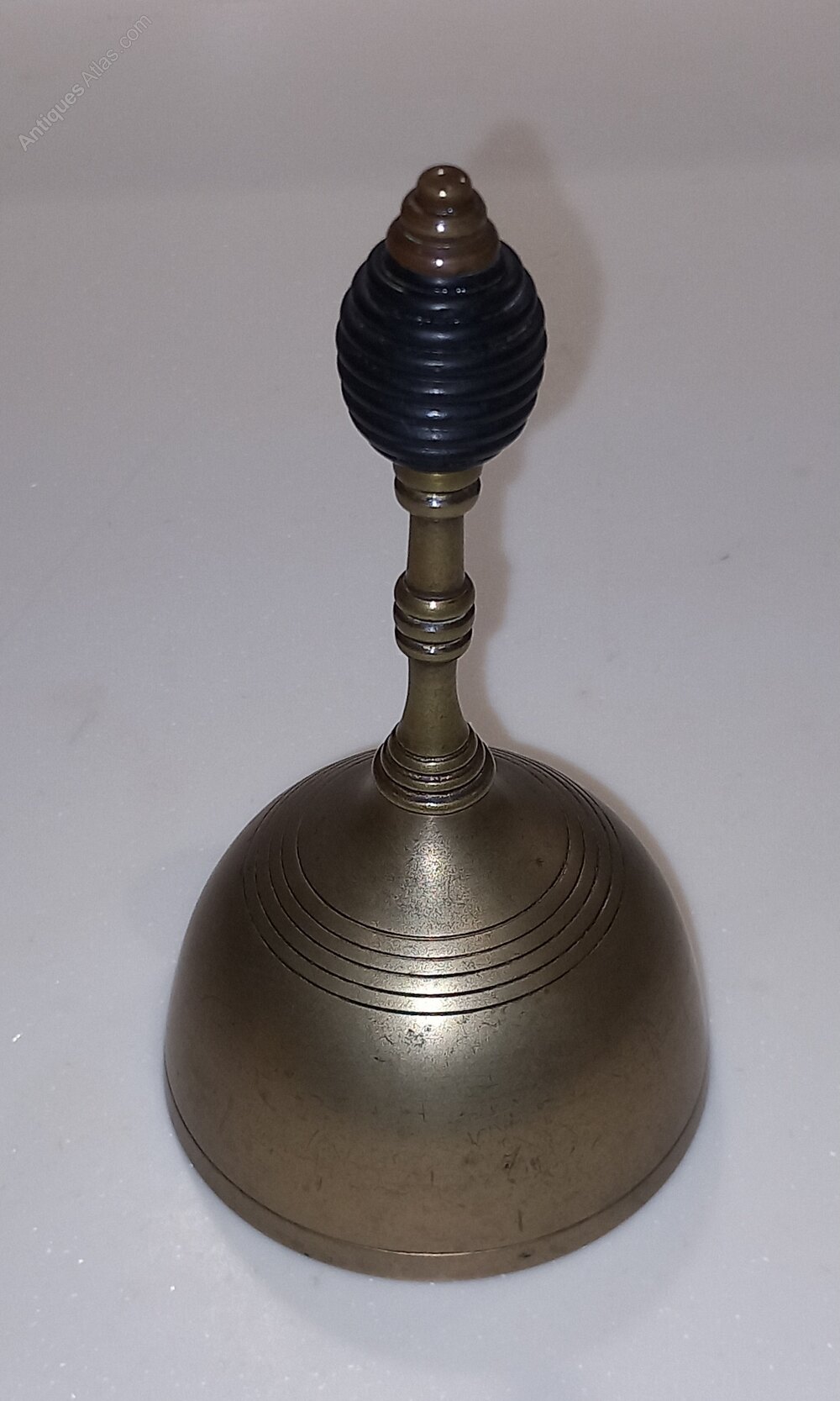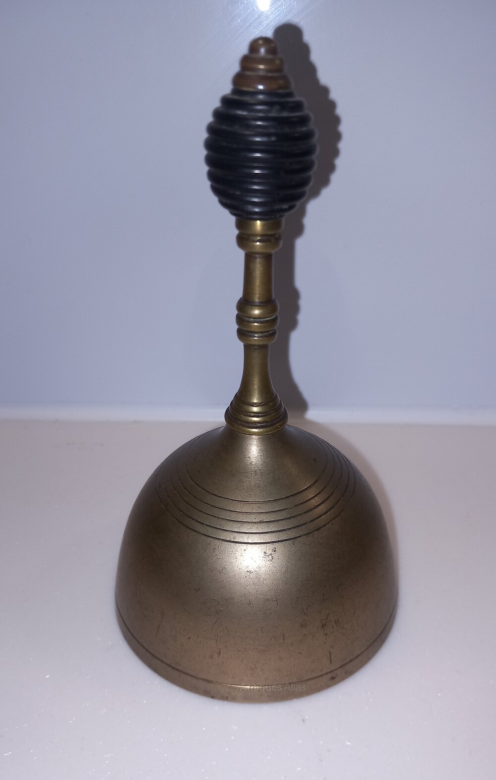 Very tactile Victorian hand bell .Summon your Butler with this wonderful brass and ebonised wood bell , beautiful tone and aesthetically very pleasing. Unpolished with an aged patina on the brass body and clapper you could give it a high polished finish if desired. 13.5cm by 7.5cm
