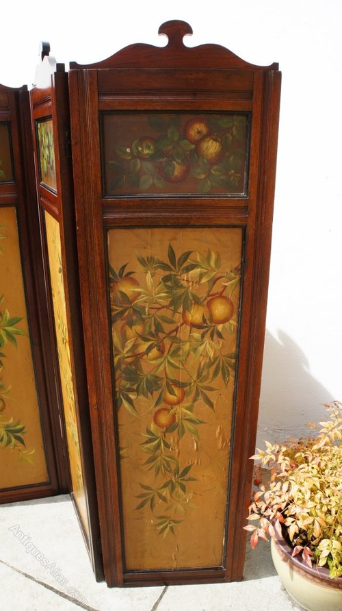 A late Victorian 4 panel Mahogany folding screen or room divider. Hand painted canvas (glued) over wood panels. Each of the panels is different, with a theme of floral/water on one side and fruit on the other.