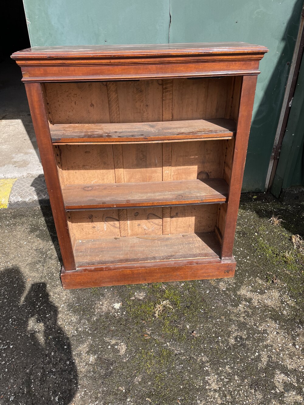 A simple late Victorian mahogany bookcase with adjustable shelving . Some marks on the top (see photo) . One shelf has a split in the wood which is easily repairable . It measures 89 cms wide x 107cms tall x 29cms deep . The shelves are 29cms deep
