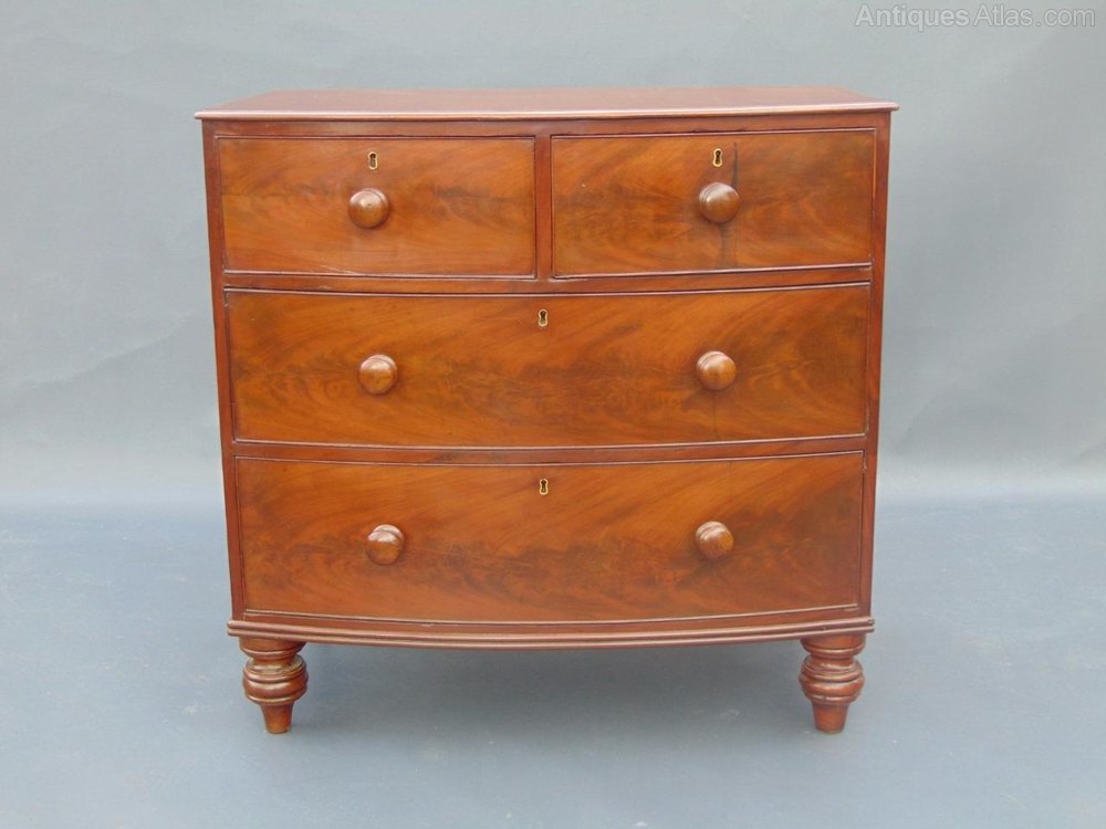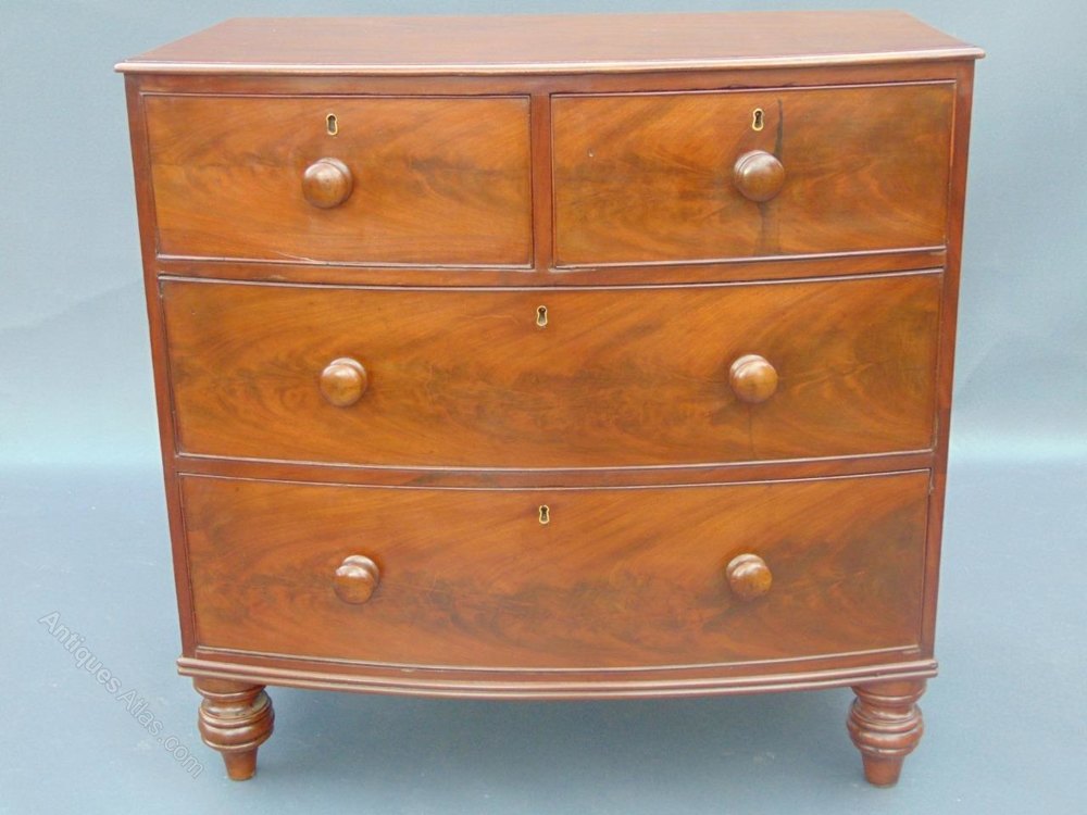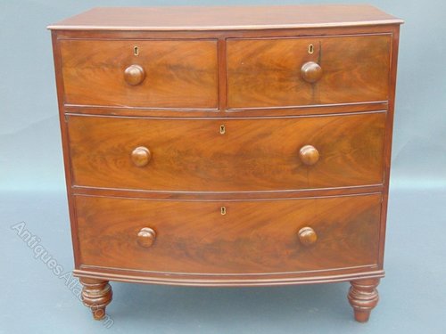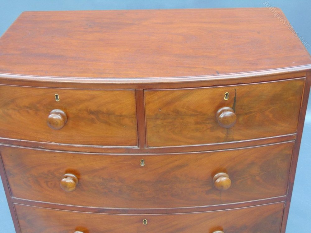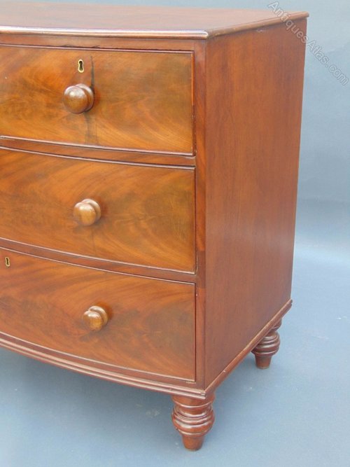 This is a good quality Victorian mahogany bow fronted chest of drawers with its original turned knobs and bun feet. The chest is in beautiful clean condition save for a historic ink mark to the top right drawer as can be seen in the photos. The chest has a good rich colour with attractive flame mahogany veneers and is in super order ready for use.