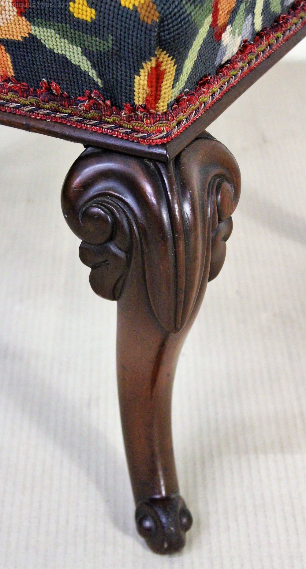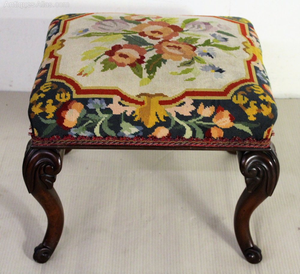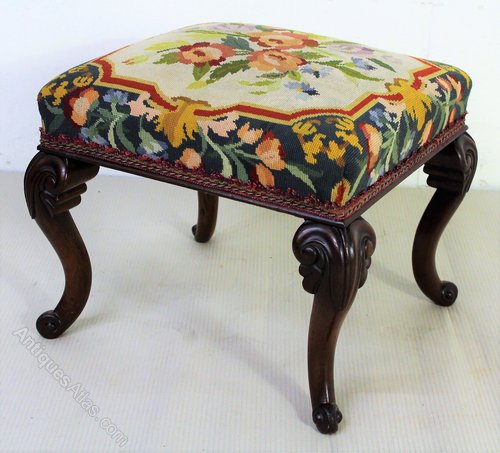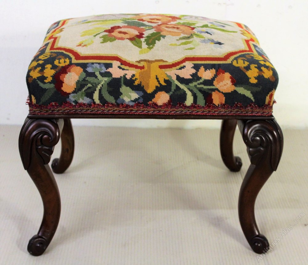 A bold and impressive mid-Victorian period mahogany cabriole legged stool. Of generous proportions and finely constructed. The frame is in excellent original condition, strong and sturdy and with a great colour and patina. The wool-work tapestry upholstery is also in excellent condition.