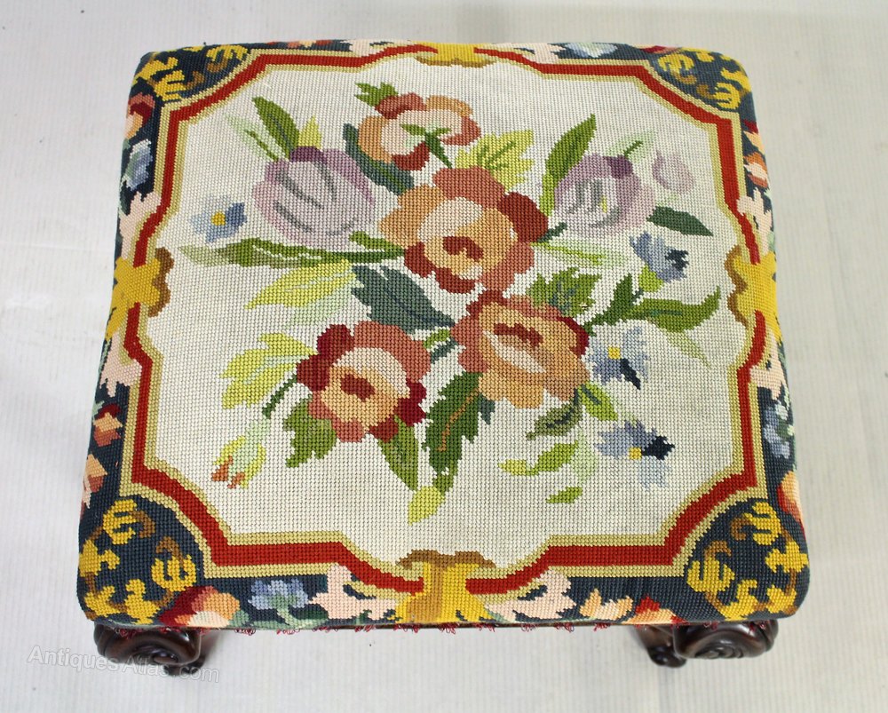 Early Victorian Sewing Box, Embroidered Foot Stool