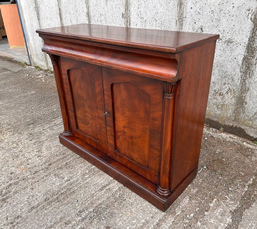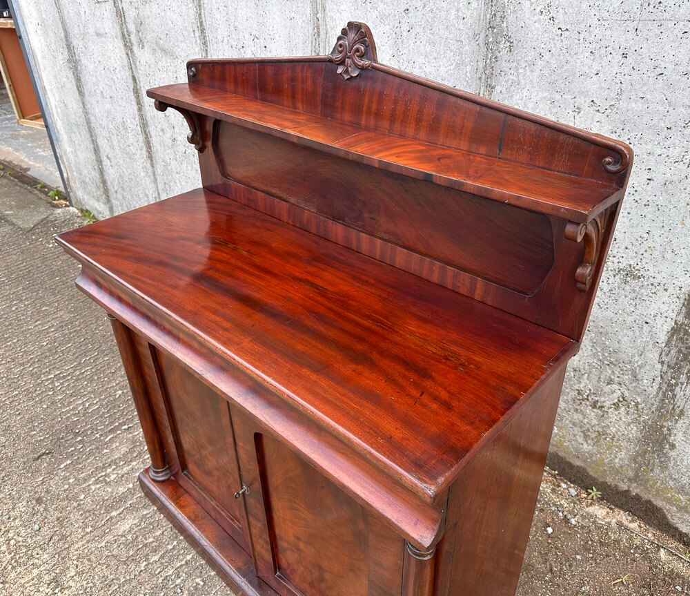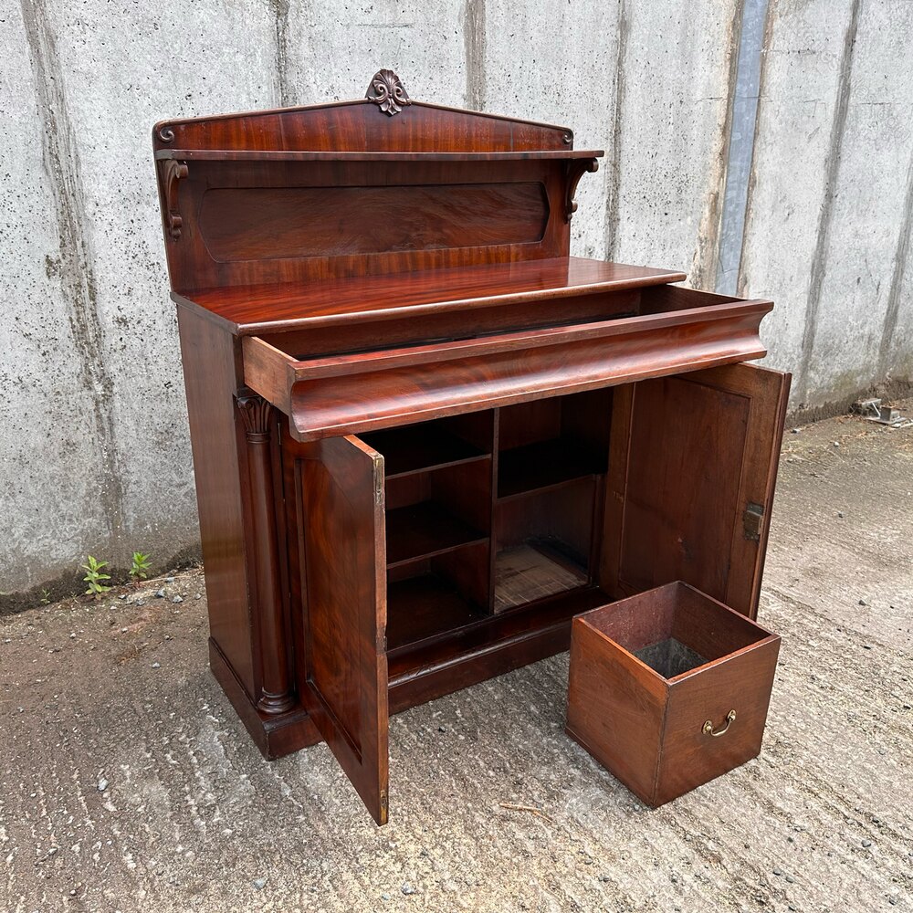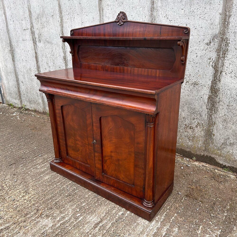 Antique English William IV / early Victorian chiffonier / sideboard, with two doors, constructed from figured mahogany, with a detachable up-stand, circa 1840. Offered for sale in acceptable condition.