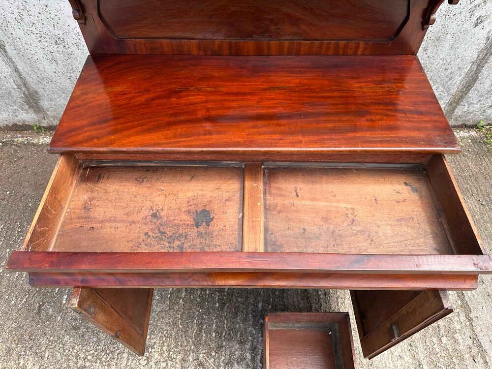 Condition Offered for sale in acceptable condition. Nominal old use marks to the top, front, leading edges, sides, drawer edges etc. The sideboard displays its original mahogany colour and patination. Minor wear to the polish in certain areas, but overall, in acceptable condition. Please see photos for condition details. The amount of restoration required is dependent on buyers’ standards and expectations for its intended place. For the majority of buyers, the original condition if it offered in, is perfectly acceptable. However, to other buyers, they may deem it requires additional restoration, depending on the buyers’ requirements. The top drawer works and is constructed with original drawer linings. The two doors lock, using the original brass working lever lock (with working key). The infernal shelves and drawer are in good clean condition. The up-stand is fitted with period steel slotted screws and can be removed if required. The sideboard is raised on its original plinth base and retains its original pine backboards.