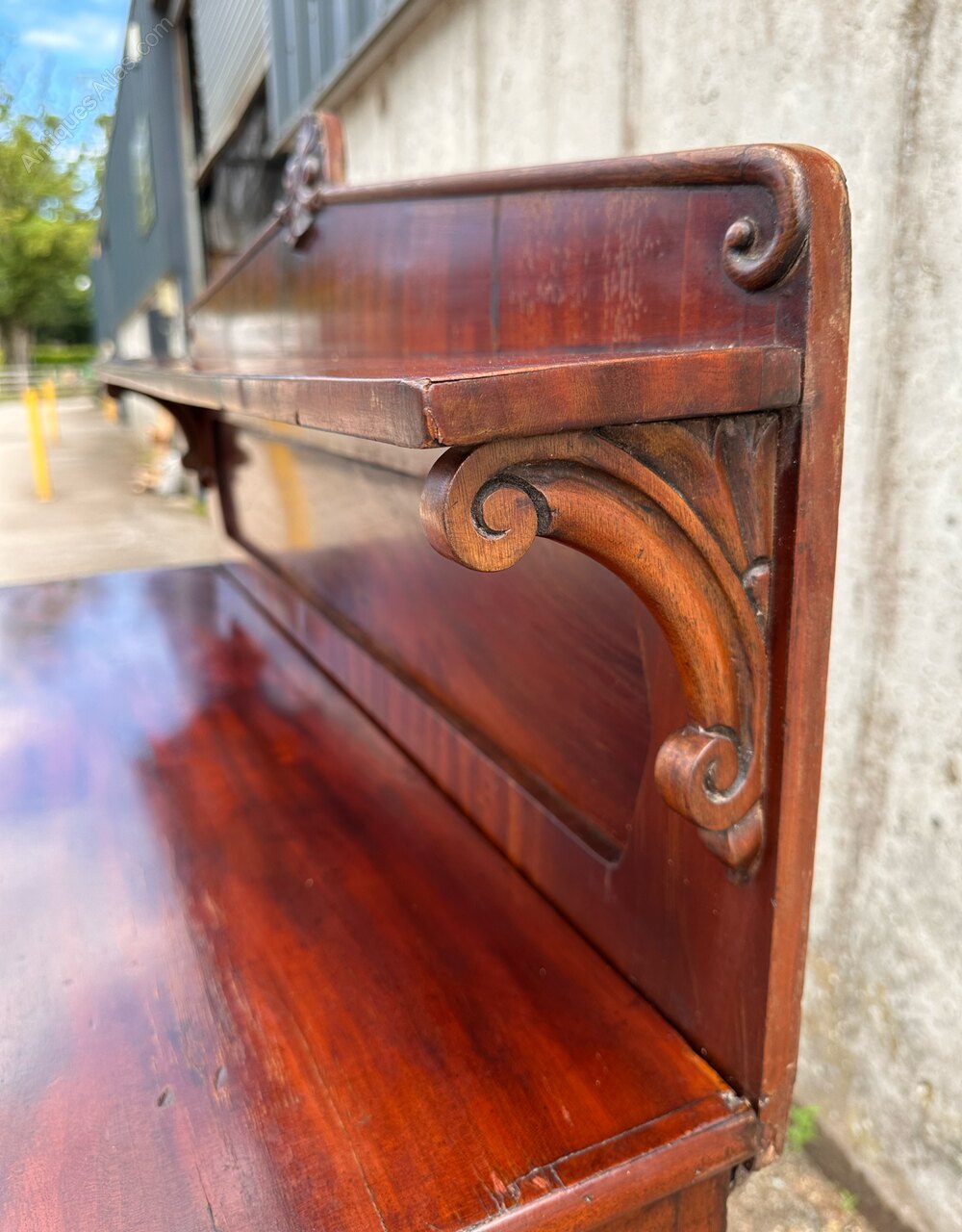 The mahogany chiffonier incorporates a detachable up-stand / back-stand, decorated with an arched back and central motif, with a shelf below, secured by carved corbels. The up-stand can be removed (several screws secure it to the base) and the sideboard can be displayed without the up-stand, as see in the pictures.