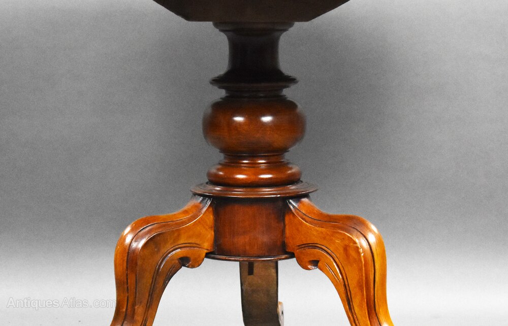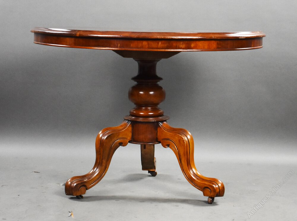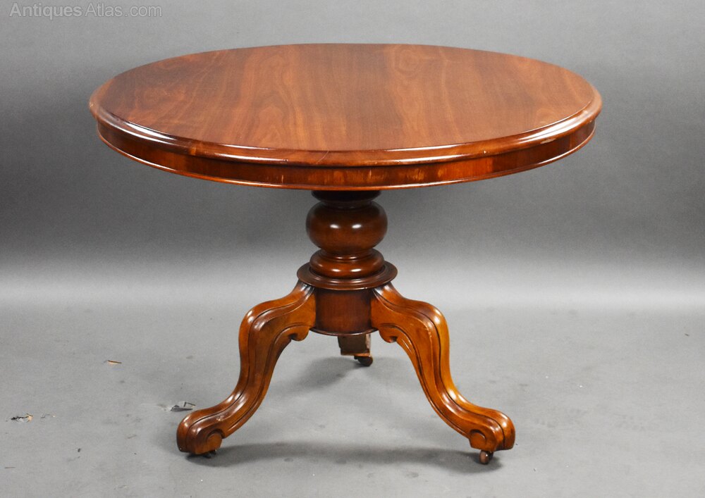 A fine quality Victorian period breakfast table of circular form, made in richly coloured mahogany with an attractive, well-figured top. The tilt-top is supported on a robust baluster column, standing on a triform base with scrolled cabriole legs and castors. With its warm finish and elegant proportions, this versatile table is ideal for both formal dining and everyday use in traditional interiors.