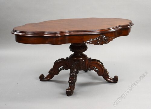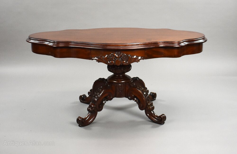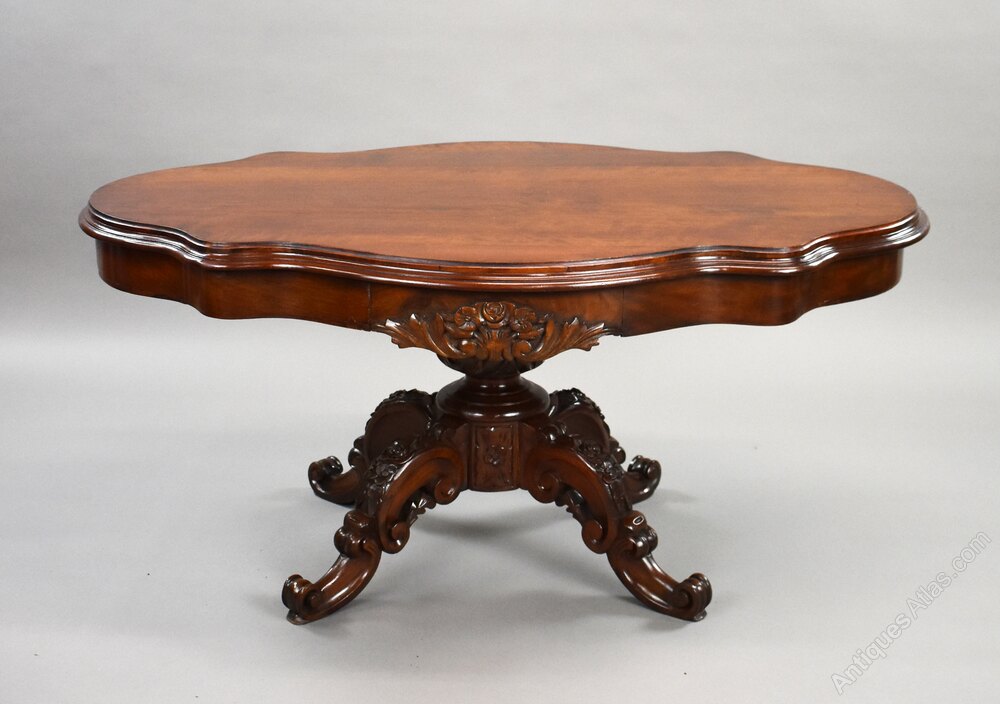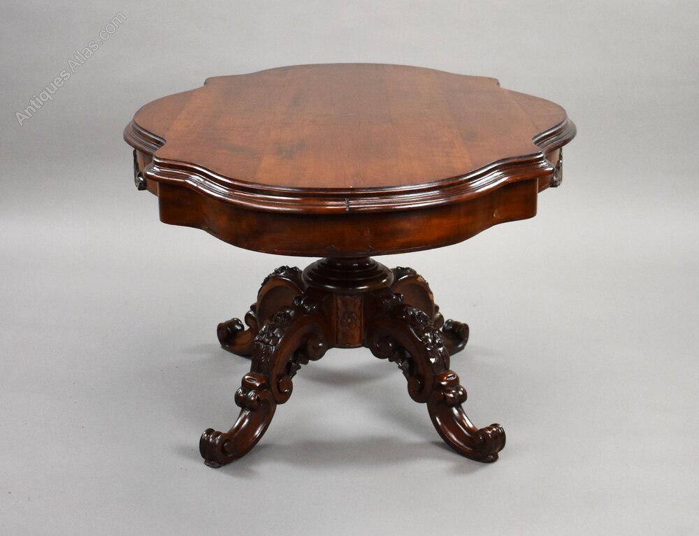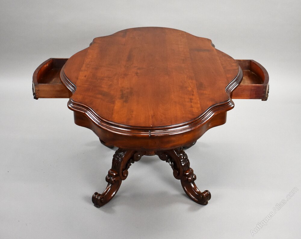 A superb 19th century carved mahogany coffee table of striking form and fine craftsmanship. The shaped moulded top sits over a frieze incorporating two concealed side drawers, offering discreet storage. The table is supported on an elaborately carved central pedestal with scrolling acanthus detail, raised on four bold cabriole legs with further foliate carving and scrolled feet. Of excellent colour and patina, this is an impressive and practical piece of 19th century furniture, ideal as a statement coffee table.