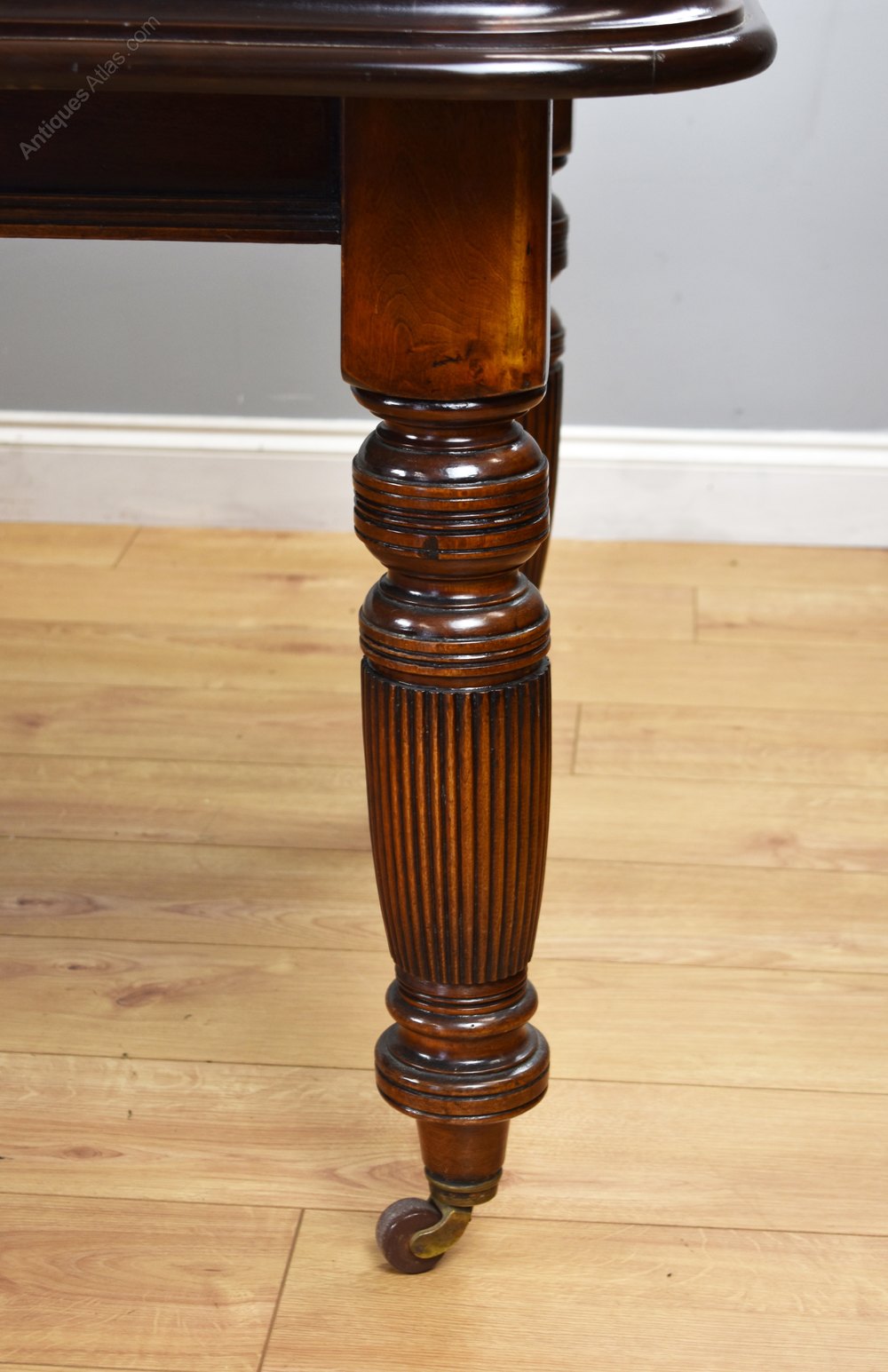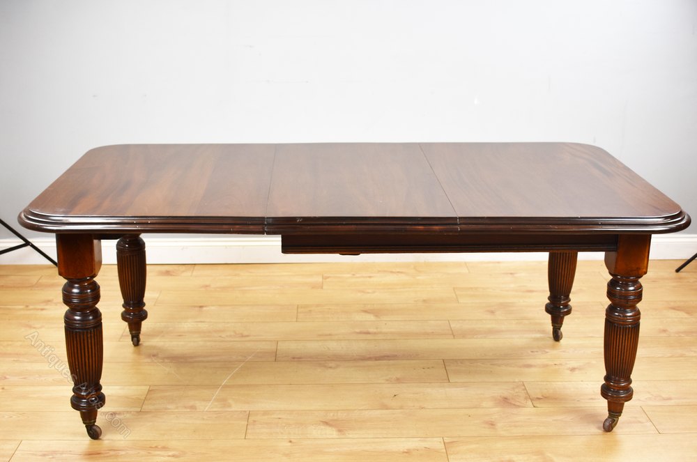 For sale is a Victorian mahogany extending dining table, having two additional leaves, standing on turned and fluted legs. The table is in very good condition for its age retaining a good even colour throughout. The pullout mechanism also runs smoothly. The table will seat 10 people.