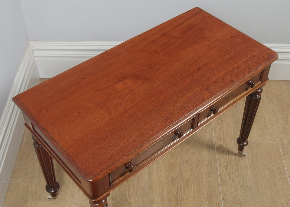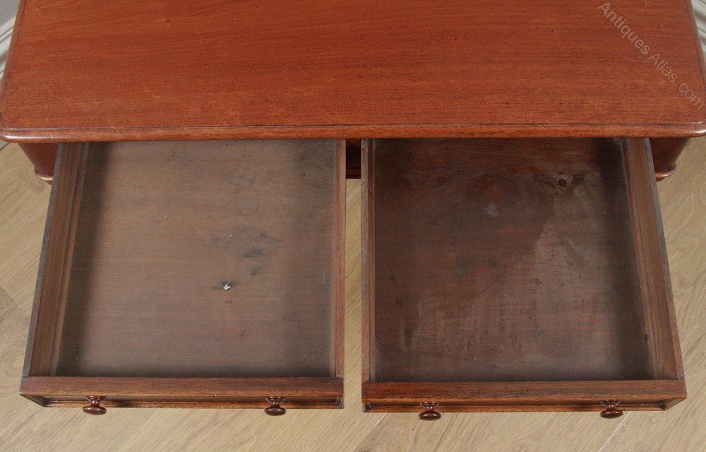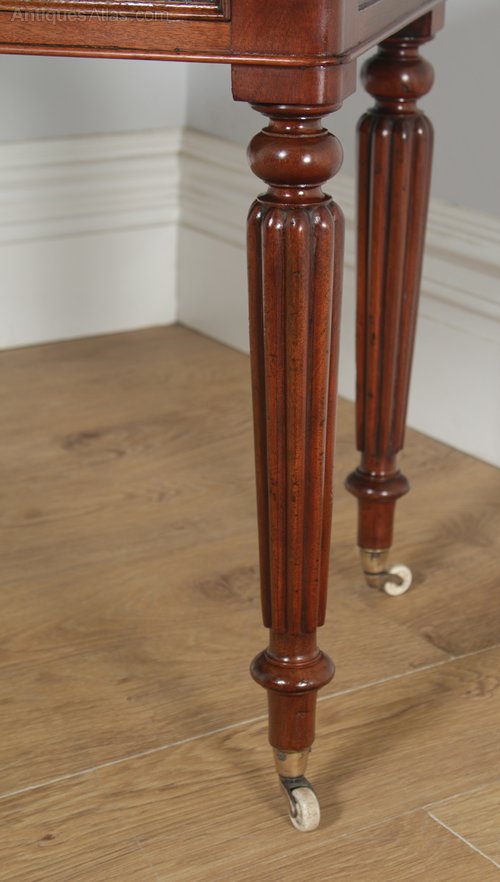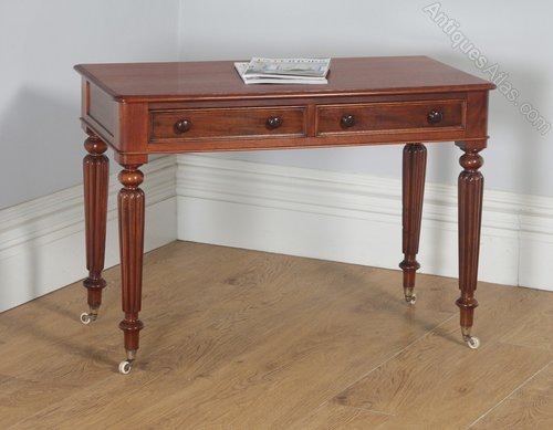 Condition This table is in good original condition. Nominal old use marks to the leading edges and drawer interiors, but nothing significant considering the age of the item. The table boasts its original brass castor cups and mug castors. The drawers are in good working order and close flush to the frame. The drawers retain the original turned mahogany knobs, which reflect the design of this period. There are no splits to the top (as the top is impressively constructed from a single piece of timber), no breaks to the legs or castors. The table boasts a fantastic colour and patination. This table is well constructed, solid in joint and ready to use.