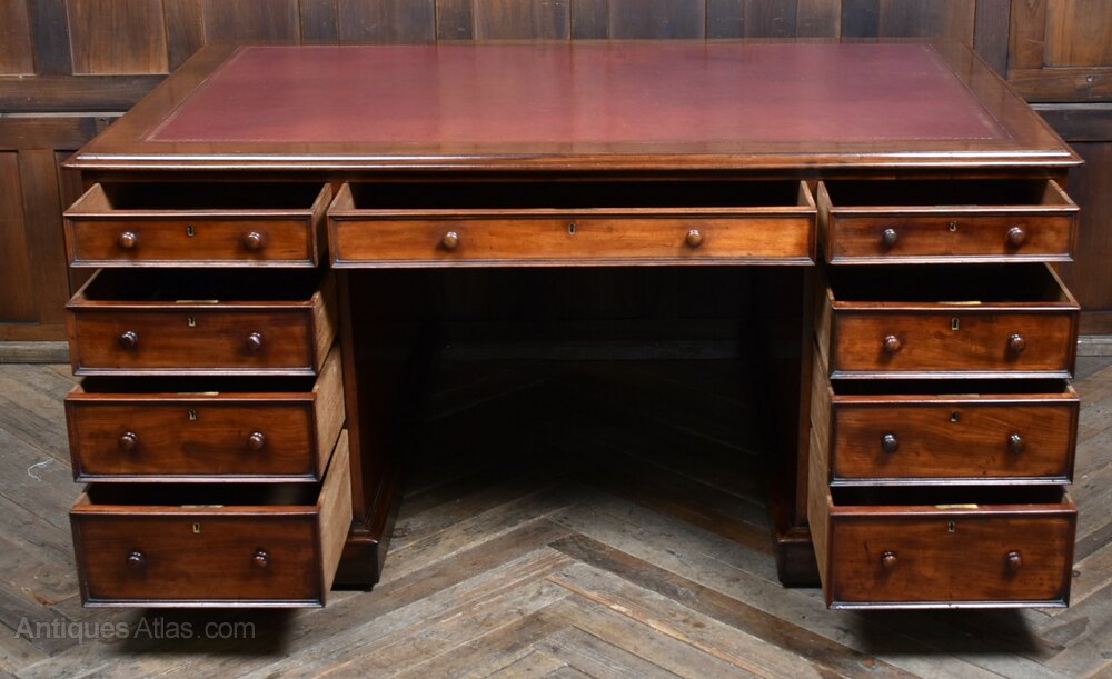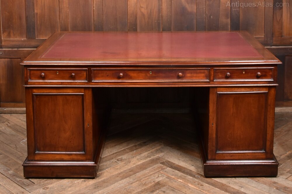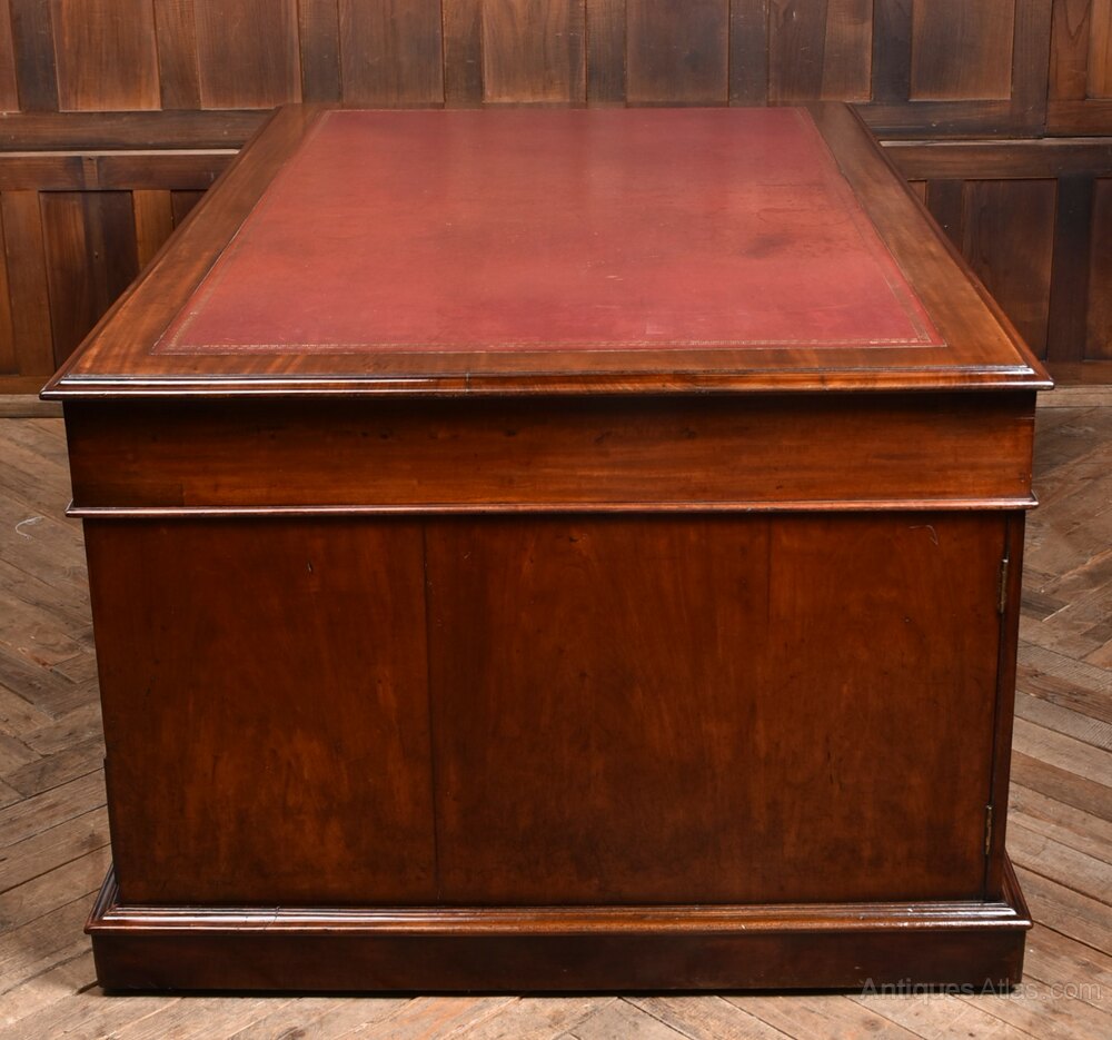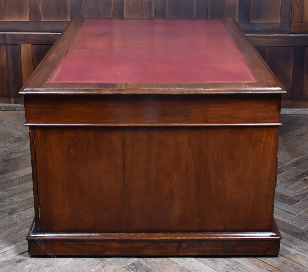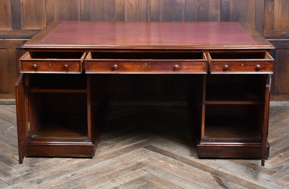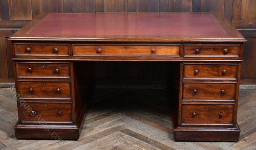 A handsome and generously proportioned Victorian partner desk, crafted in rich mahogany and presented in excellent antique condition. The original red leather insert, bordered by a moulded edge, adds warmth and gravitas to the expansive work surface. This desk offers ample storage and a commanding presence—ideal for a home office, study, or library. The deep mahogany tones and aged leather create a distinguished aesthetic, while minor imperfections consistent with age only enhance its character. A superb example of Victorian utility and elegance, combining generous workspaces with refined detailing. A true statement piece for any discerning interior.