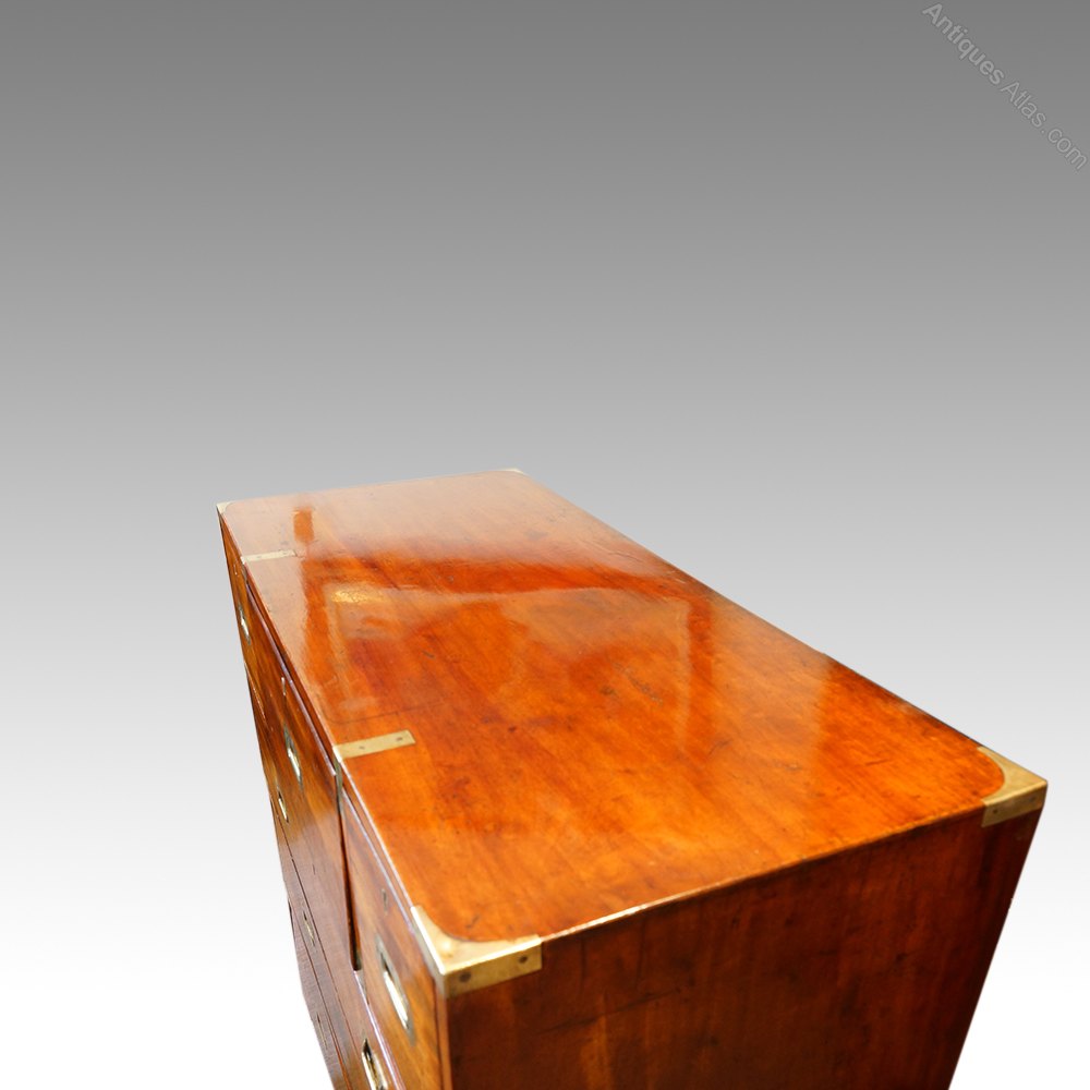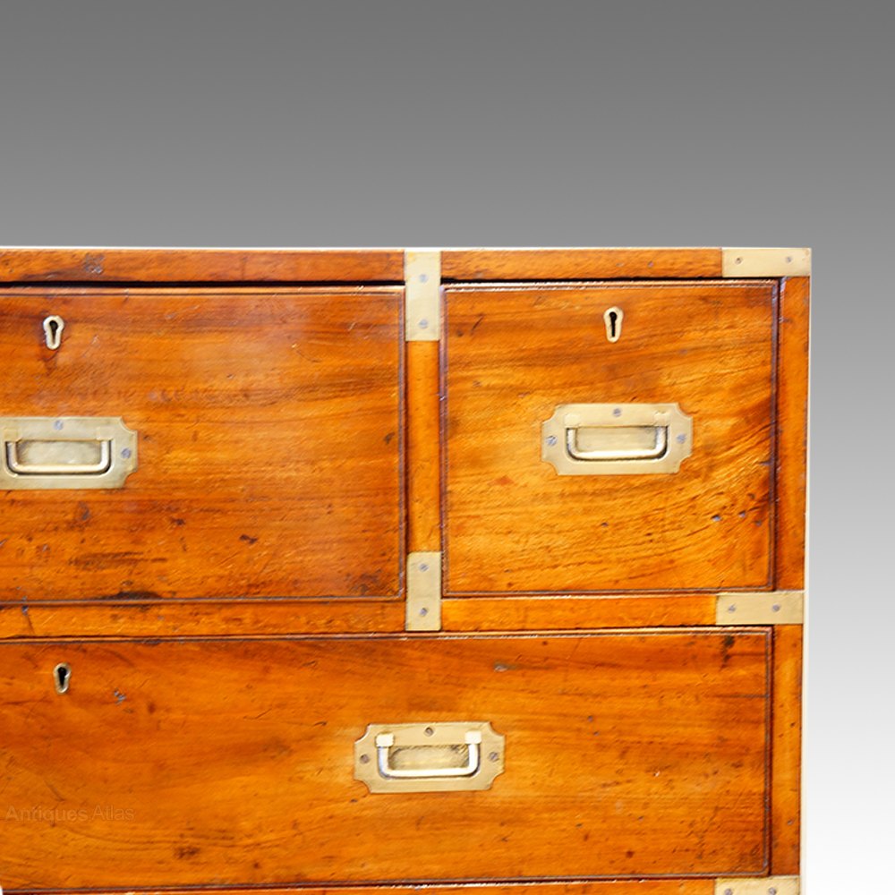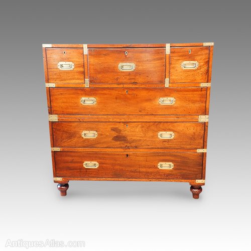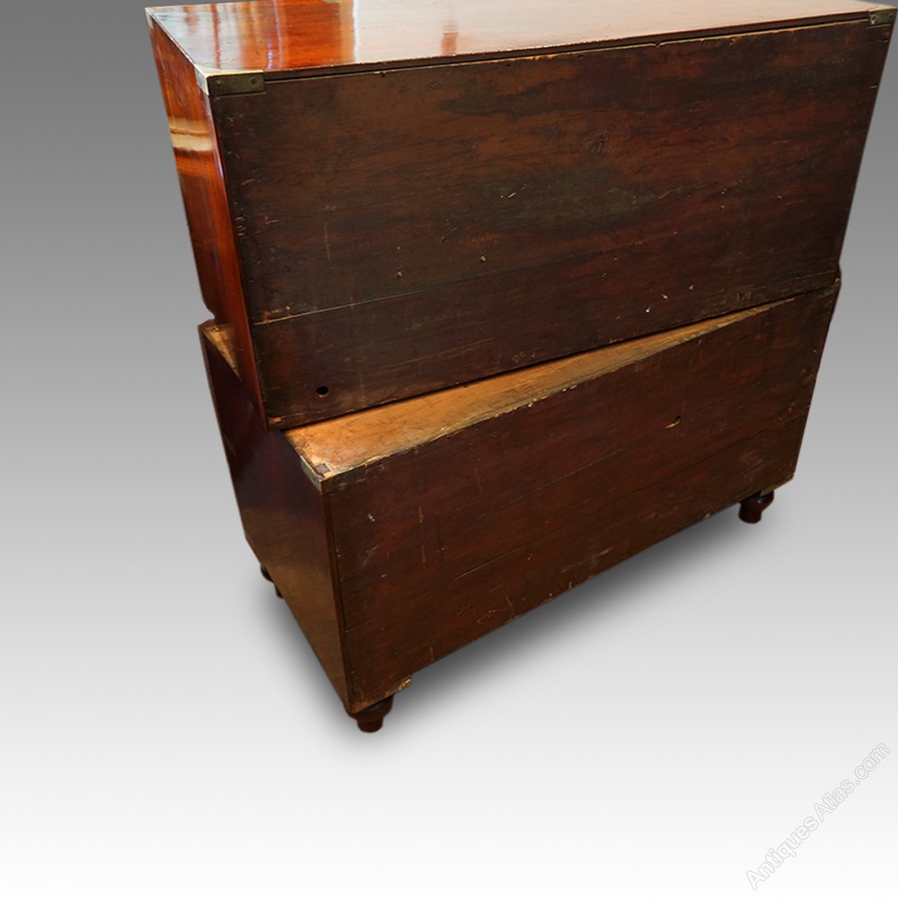 This particular chest would have been made for an officer for campaign. The top section has a secetaire in the middle drawer and flanked on each side by box drawers and a drawer under