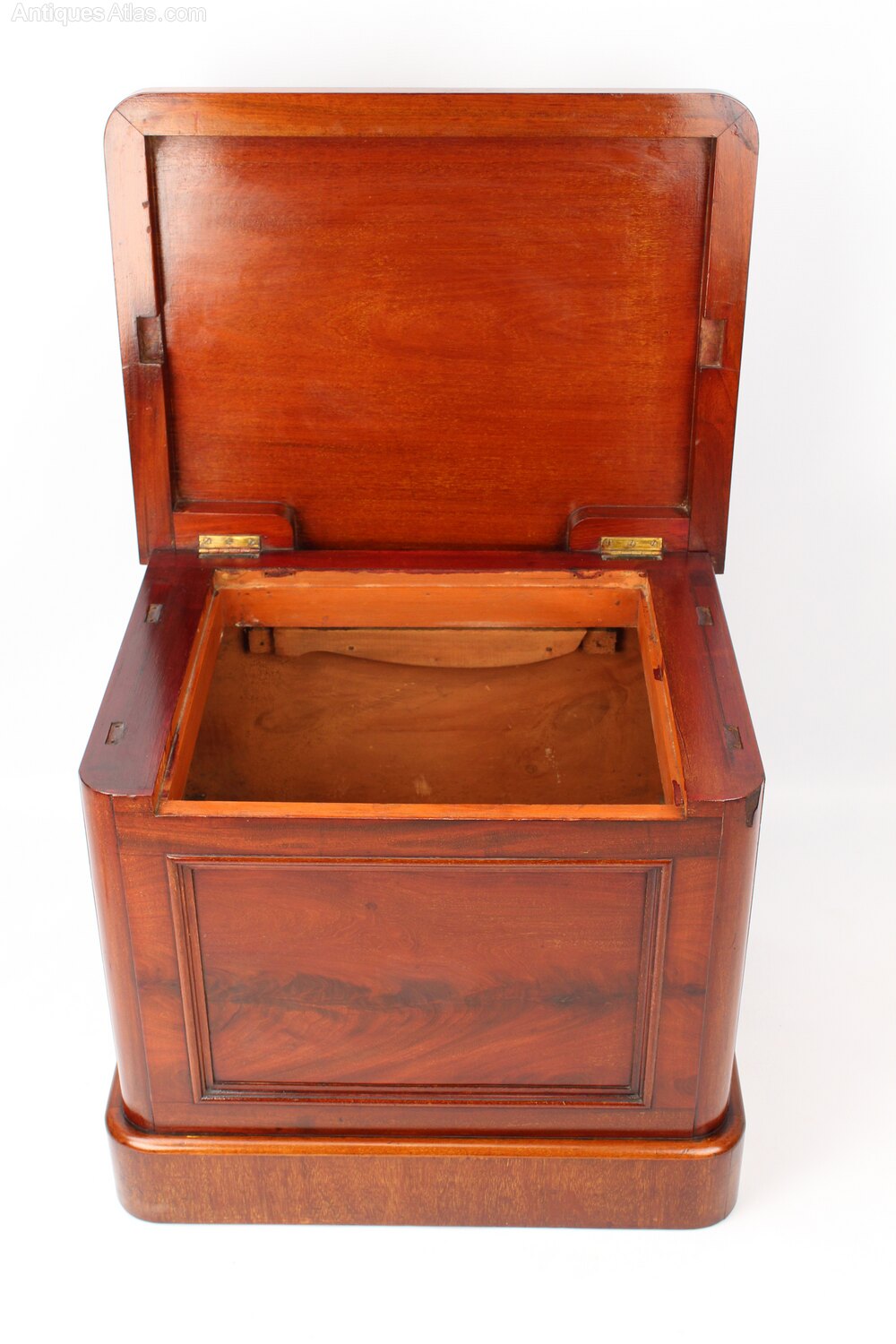 A handsome antique Victorian shoe cabinet or ottoman in figured mahogany dating from circa 1880 converted from a box commode. Featuring a lift up lid with original brass cup handles to the sides. It has a beautiful flame figured mahogany panelled front and stands on a shaped plinth base. Lovely age and patina to the wood. This piece would have originally started life as a box commode / chamber pot and has been converted into a shoe box /ottoman at some point. An attractive piece it would make a lovely hall cupboard for storing shoes and slippers or as an ottoman in a bedroom.