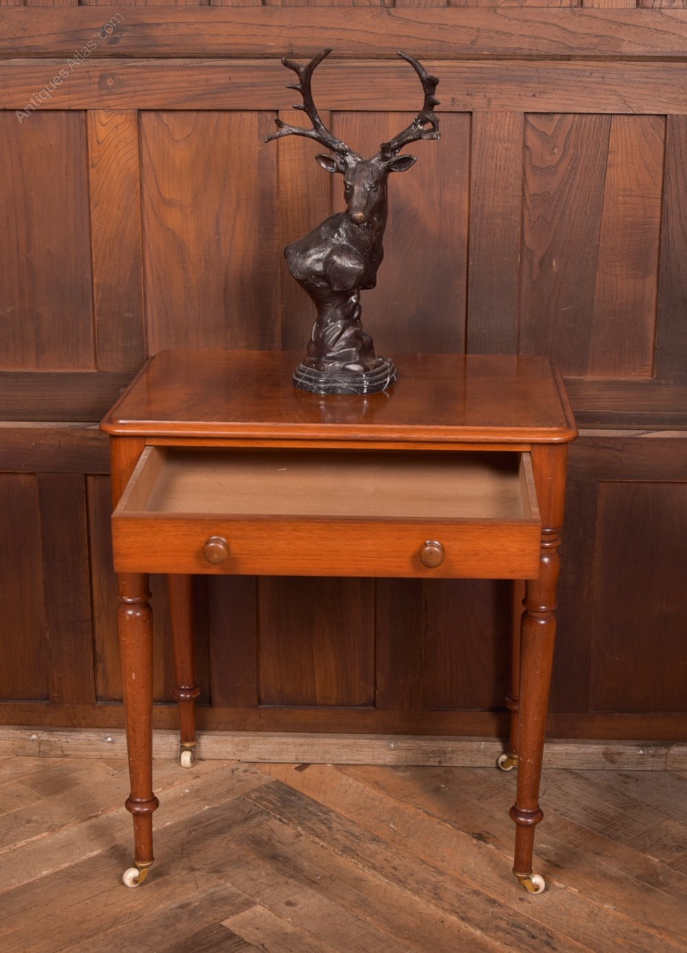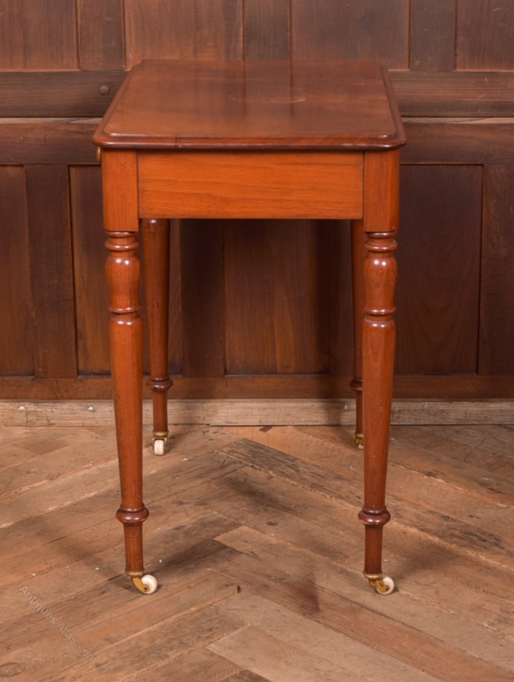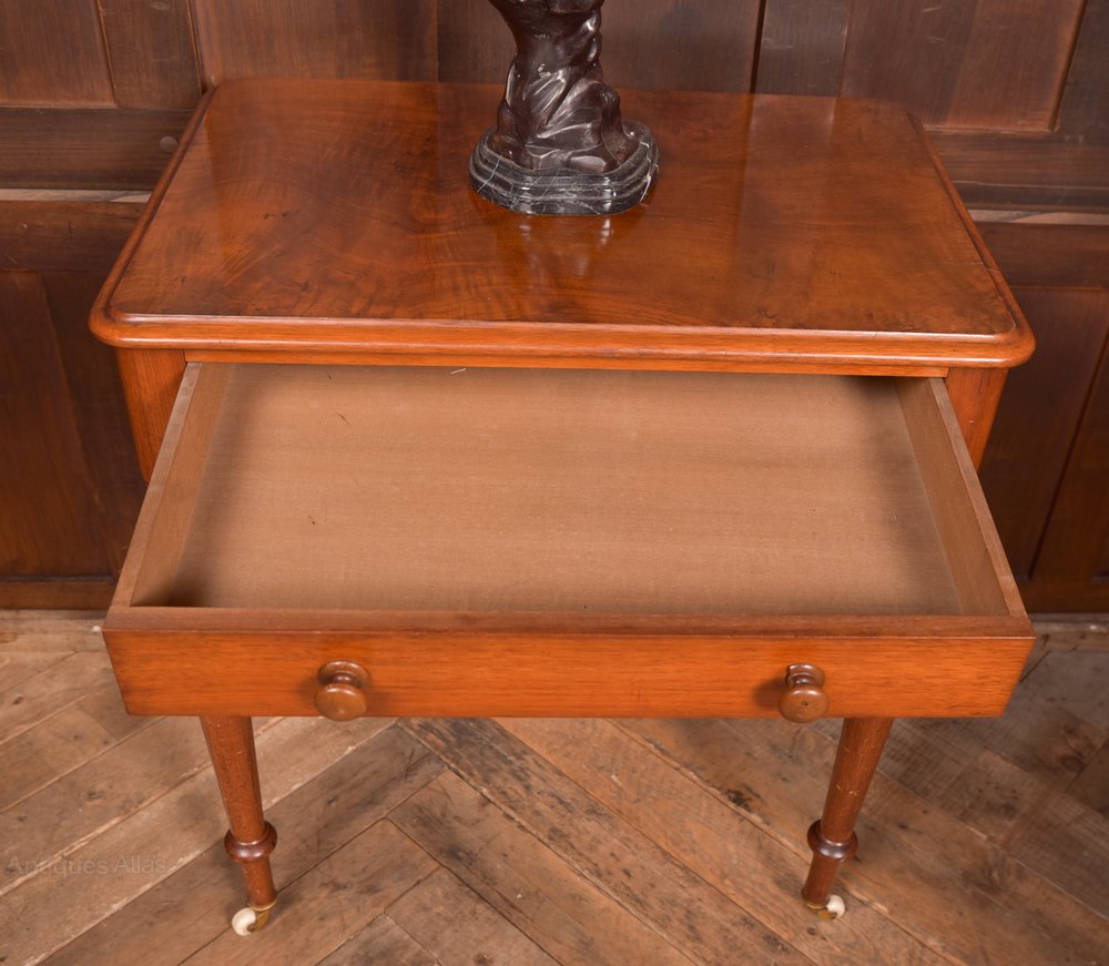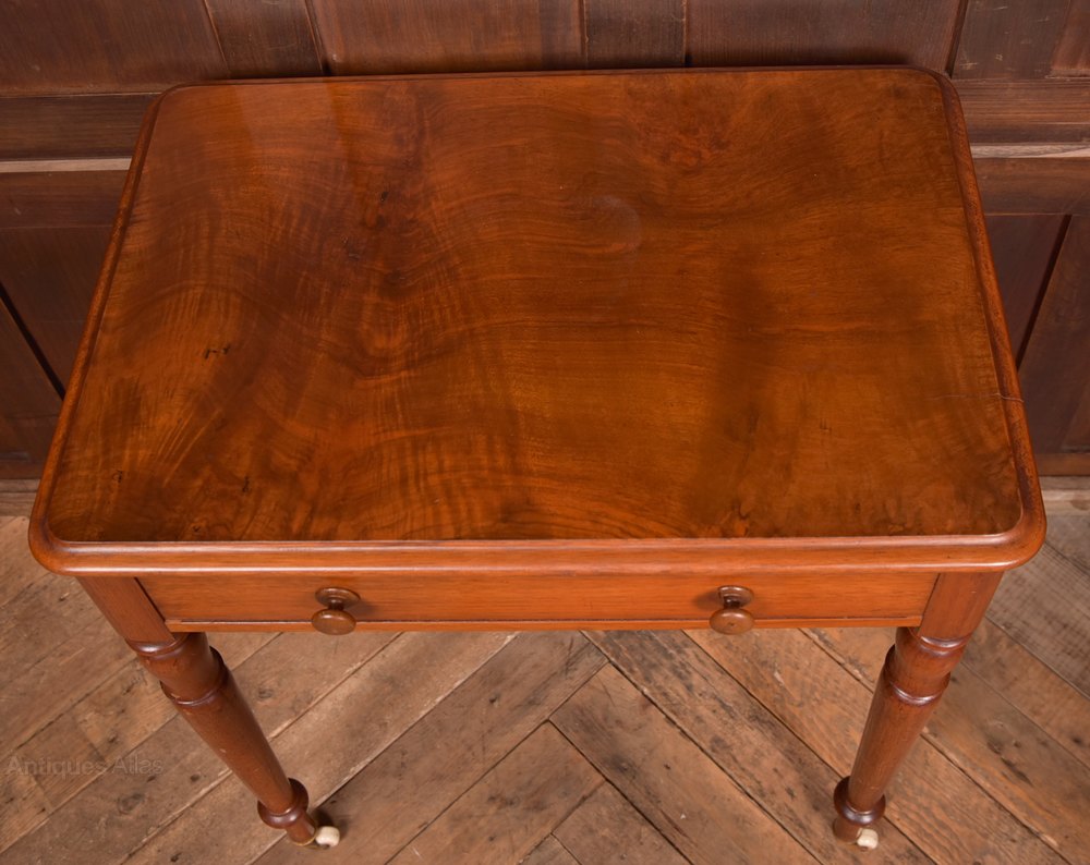 Wonderfully neat Victorian mahogany side table in excellent condition with only minor marks/ scuff in line with age and use. The thumb mould edge top has amazing graining and sits on a single drawer having two turned bun handles, standing on four beautifully turned legs terminating on original china casters. A gem of an item that will look stunning where ever it is placed in the home.