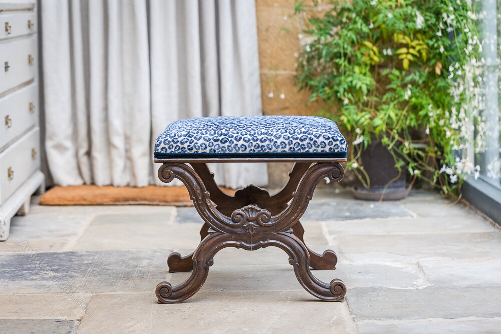 label, a turned stretcher connecting the scrolled x frame, newly upholstered with Colefax and Fowler Leopard cut velvet.