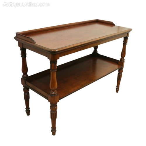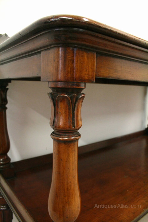 Circa 1850, good quality Victorian mahogany two tier buffet, with a neat shaped gallery back. Below the top is a shaped apron and the second tier which has a reeded front. The piece is supported by turned and fluted legs with carvings at the top. The piece is sturdy and stylish.