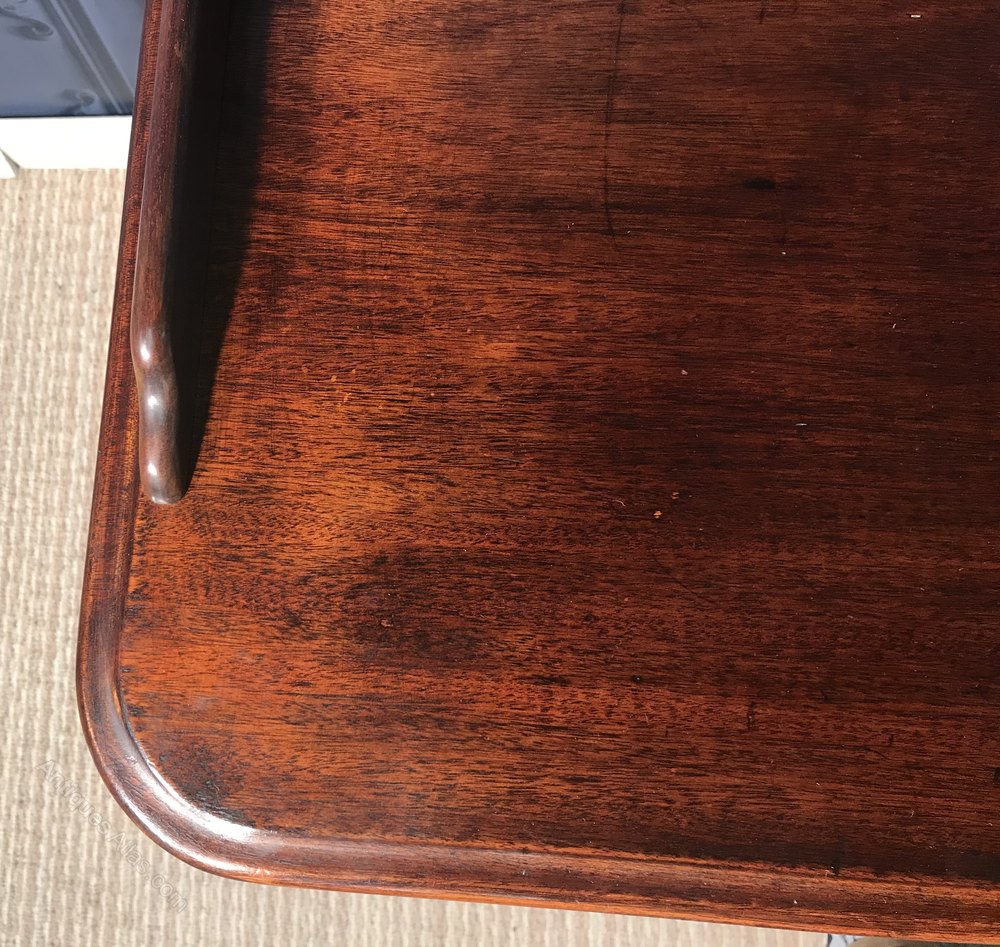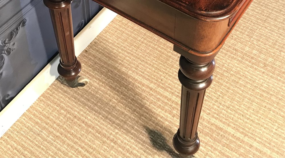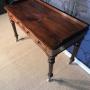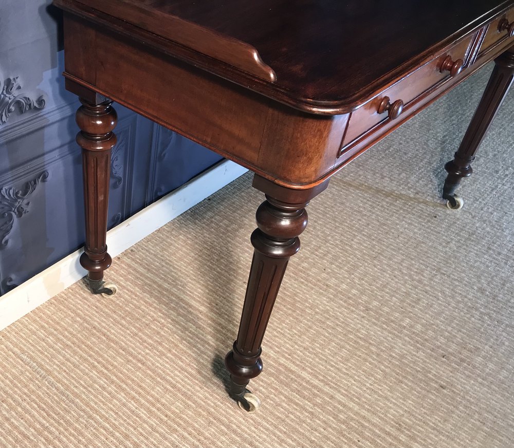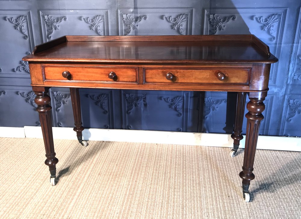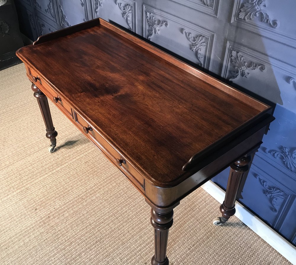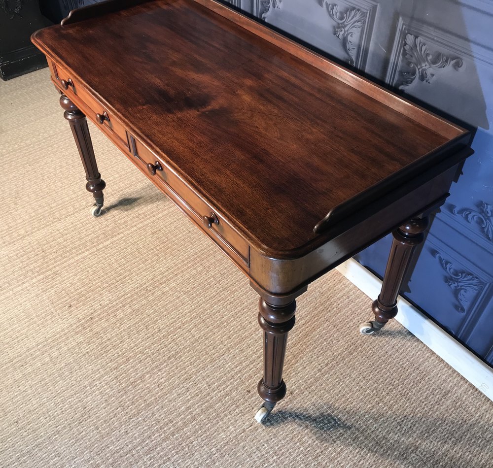 Good quality Victorian Mahogany writing/side table with raised gallery and two short drawers to the frieze supported on fluted legs terminating in a brass cup and porcelain castor, cleaned and waxed by ourselves using traditional methods