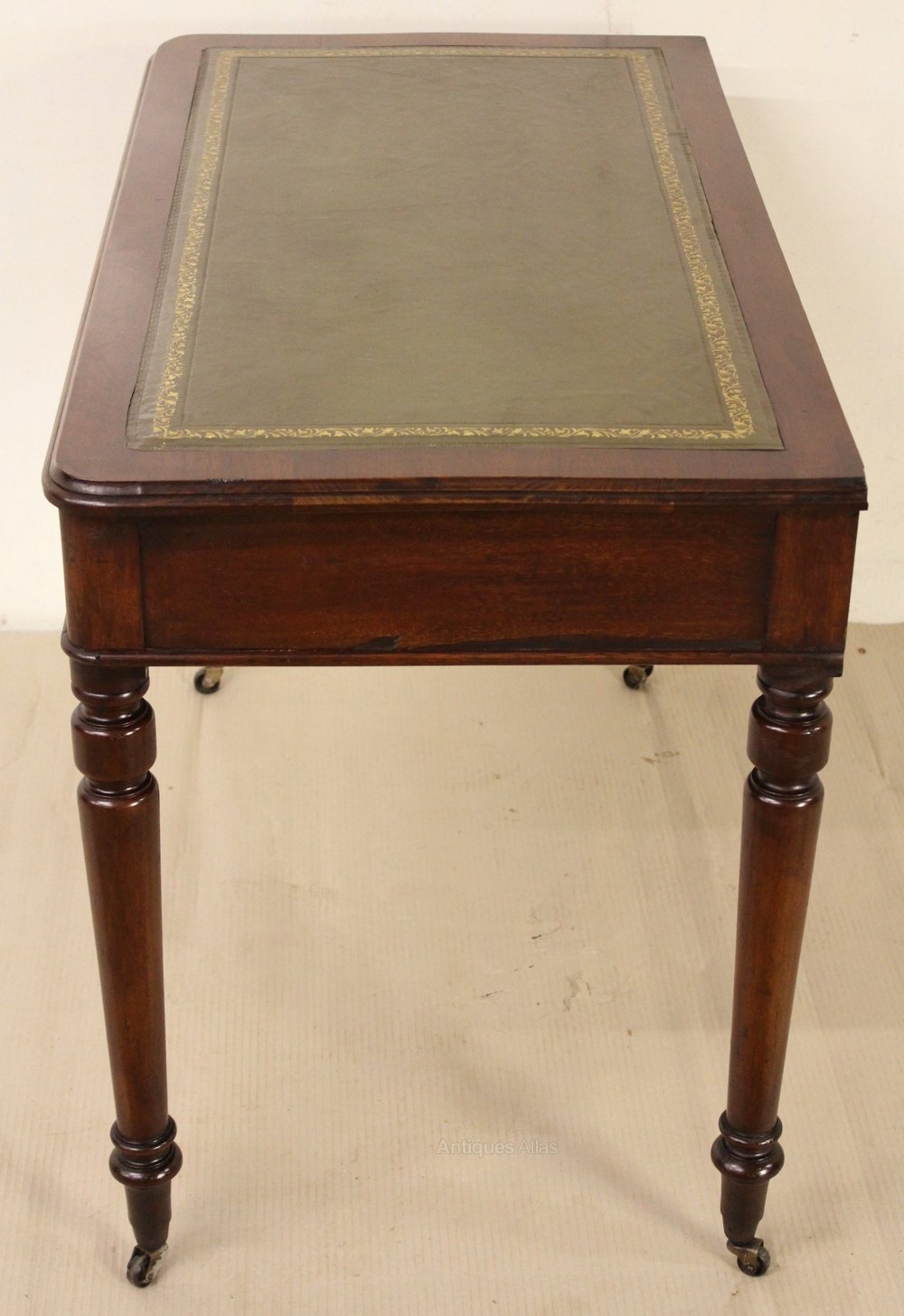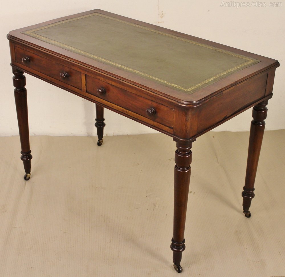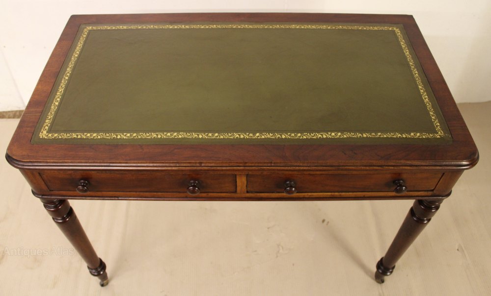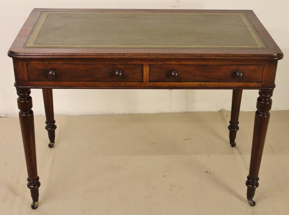 A good mid-Victorian mahogany 2 drawer writing table. Well made with two drawers , each fitted with their original small "bun" handles. The top is fitted with a sumptuous green leather writing surface which is decorated with gilt tooling to the edges. The table stands well on elegant turned legs which terminate in their original brass castors. We have had this table sympathetically repolished to a very high standard and it is now offered for sale in very good condition, ready to go straight into the home. It has a good warm colour and patina and is free from all wobbles.