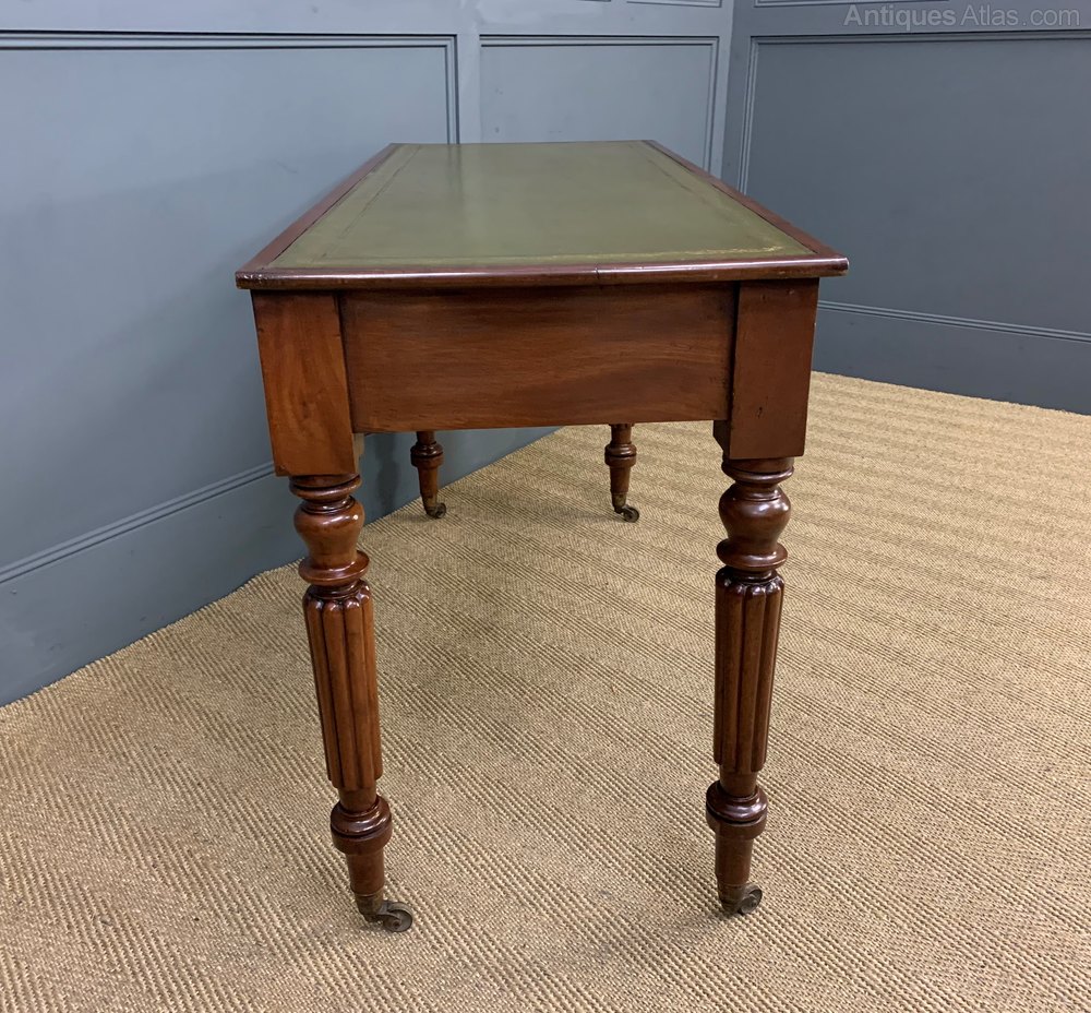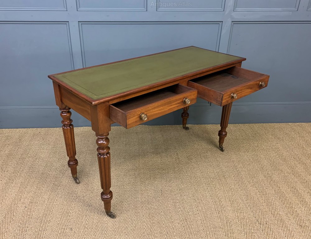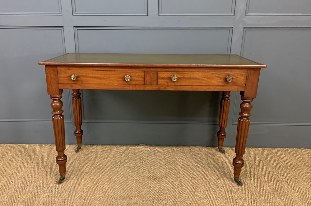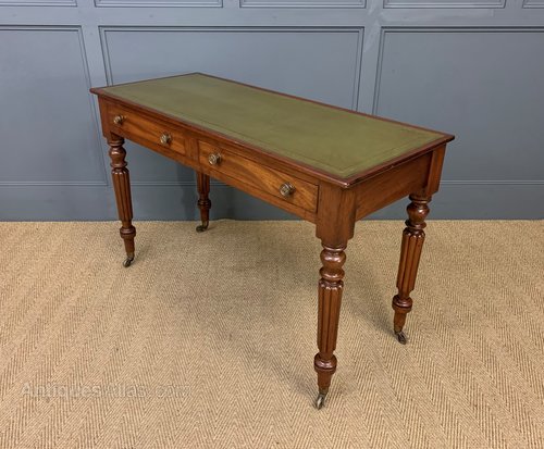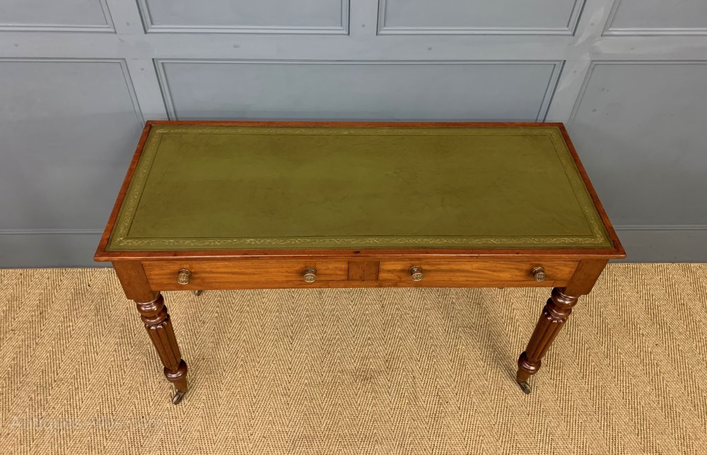 A very good mid-Victorian period mahogany writing table. Of excellent construction in solid mahogany and fitted with a sumptuous green leather writing surface. With a pair of drawers , fitted with their original charming solid brass handles. All standing on turned , reeded legs, in the manner of Gillows. The legs terminating in their original brass castors. Sympathetically refinished in our workshops to a very high standard and now offered for sale in excellent condition, with a great colour and patina, ready to go straight into the home or office.