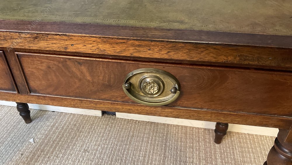 Good quality early Victorian Mahogany Writing table with inset gilt tooled olive coloured leather writing surface, fitted with two drawers to the frieze on ring turned legs. The desk has been cleaned and waxed by ourselves using traditional methods.