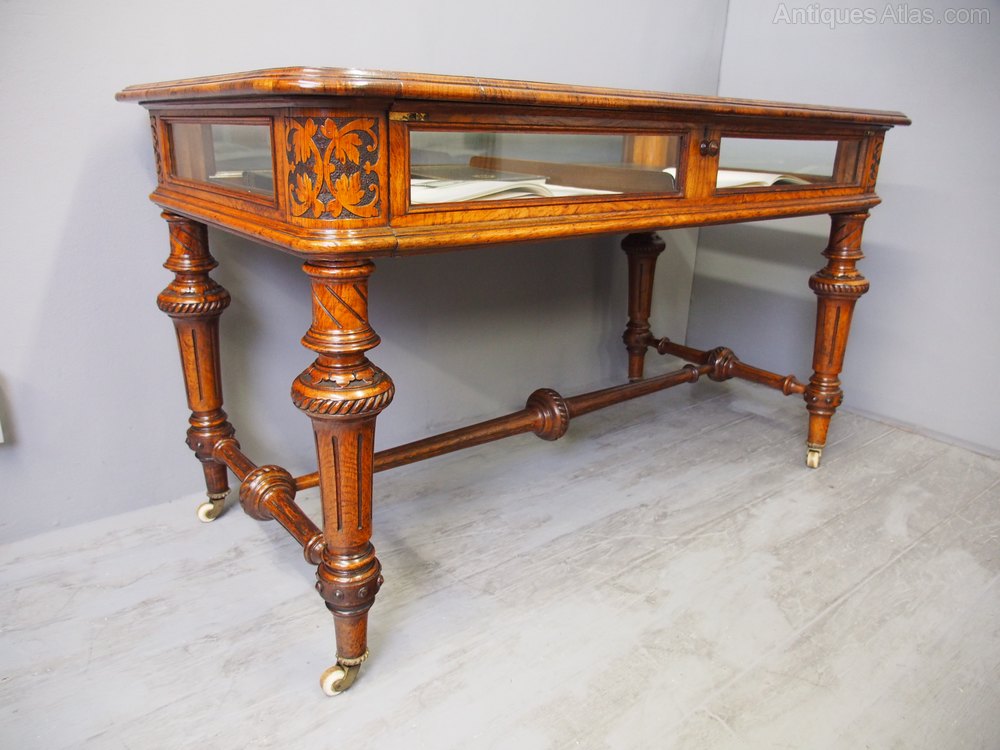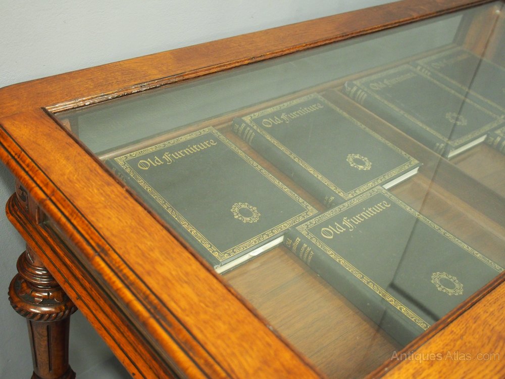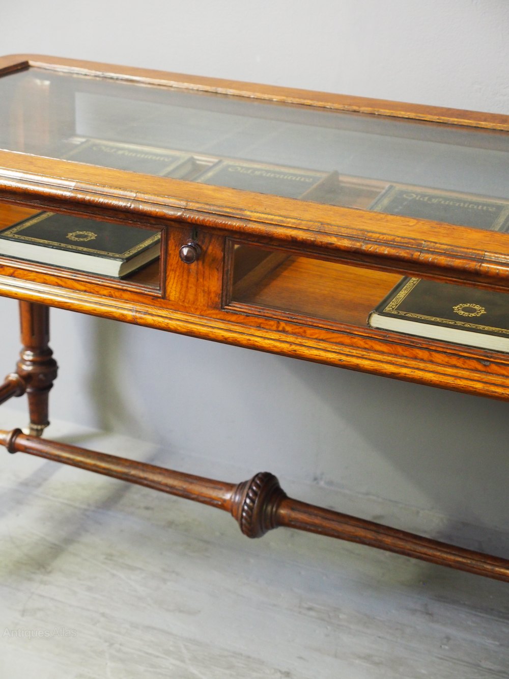 Circa 1870, a museum quality Victorian oak bijouterie table or display table. The glazed rectangular top has outset rounded corners above glazed side panels. It has one door and is raised on turned and tapering supports, ending on ceramic casters and joined by H stretchers with bulbous sections in the centre. The generous sized table offers lots of opportunities for collectors.