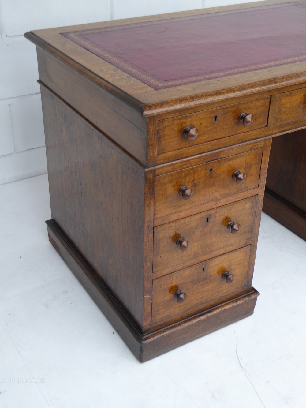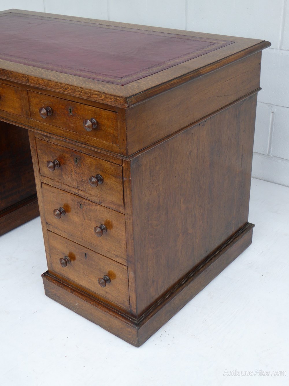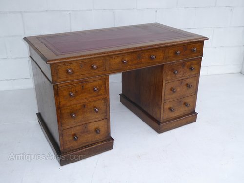 For sale is a Victorian Oak Pedestal Desk. The top of the desk has a red leather insert decorated with gold tooling. This is above an assortment of three drawers (one long, two short) The top fits onto two pedestals, each with three drawers and turned handles. The overall condition of the desk is good, with minor wear commensurate with age and use.