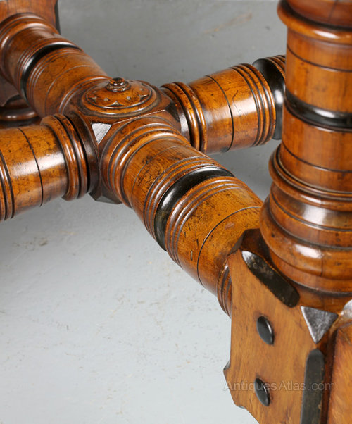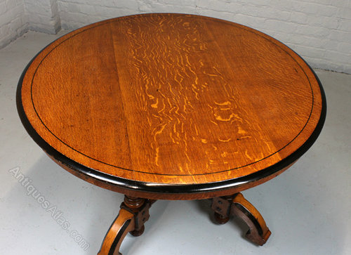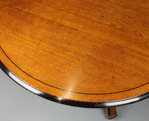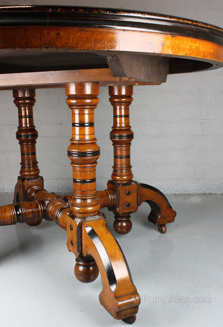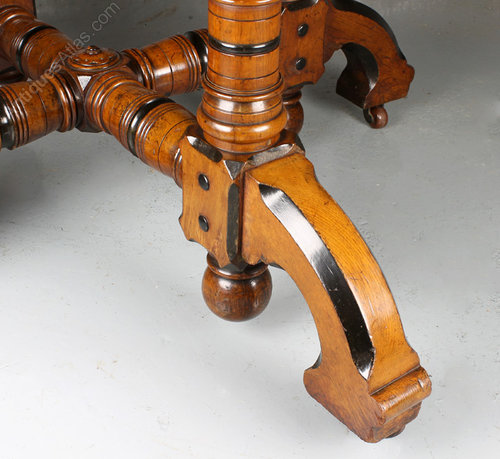 Unusual circular oak dining or centre table c.1870. Of exceptional quality with solid oak top on a particularly good base with stout turned legs and stretchers on shaped feet with large spherical finials below and original porcelain castors. Striking design with a flavour of the gothic revival and arts and crafts movements popular with British designers of this time. Though there doesn’t seem to be a maker’s mark, the ebonised detail is very much in the style of Lambs of Manchester. In excellent condition.