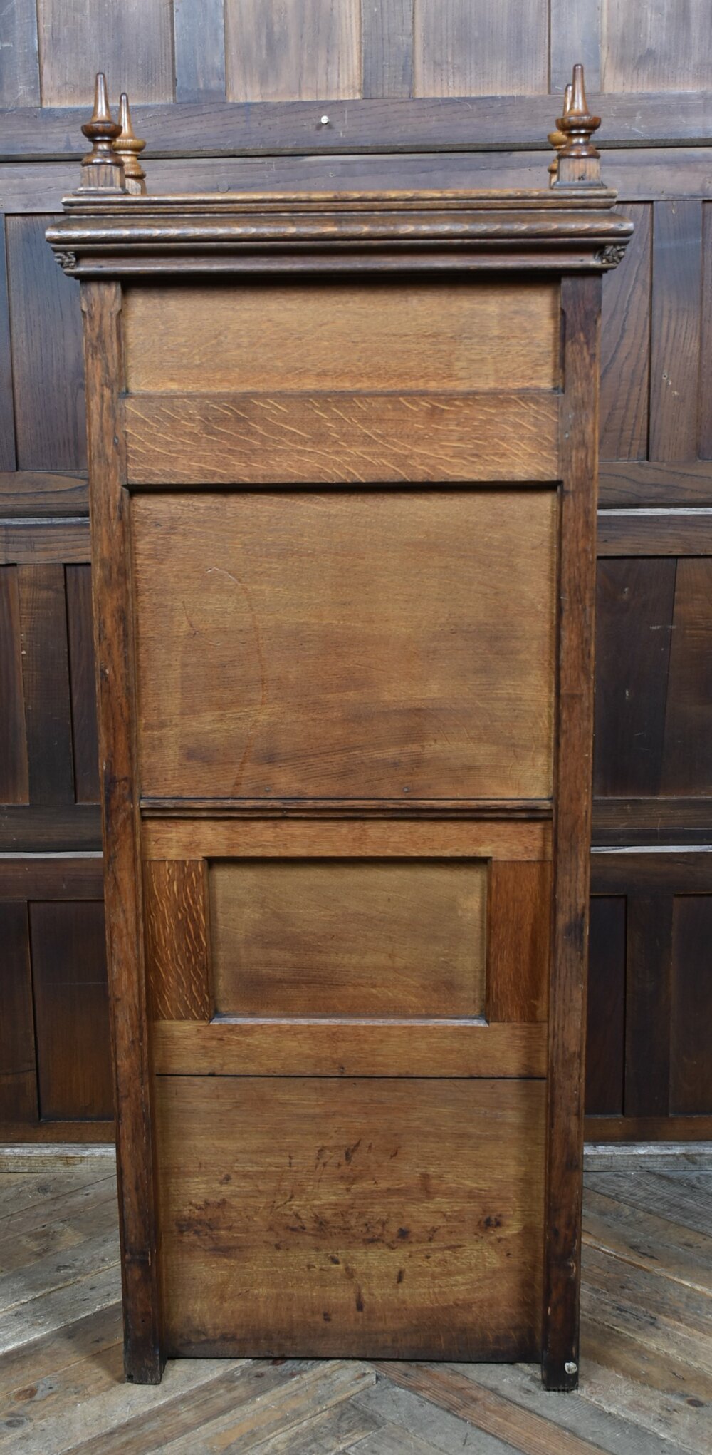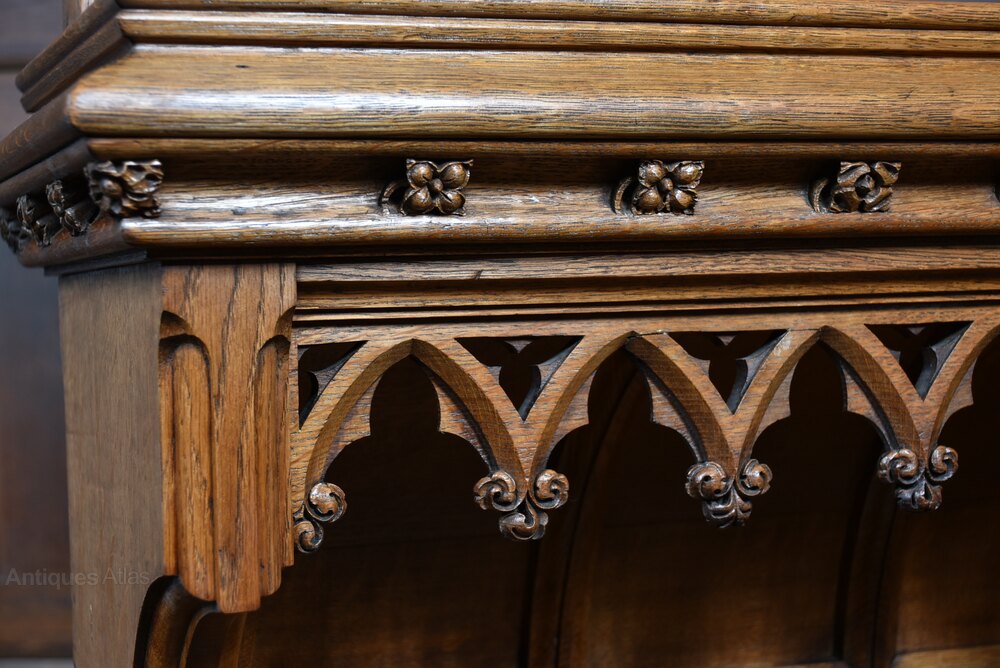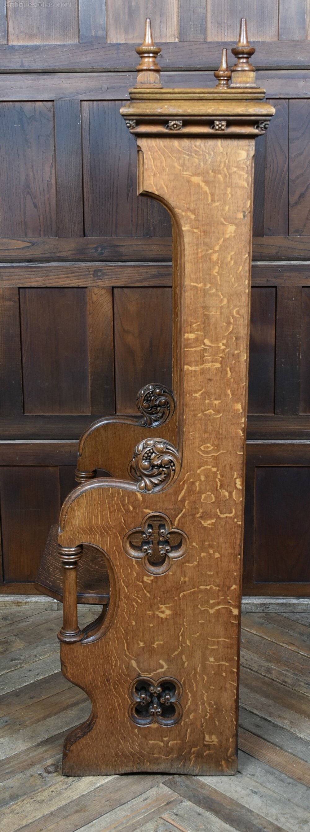 A striking Victorian oak hall chair in the Gothic Revival style, richly carved with architectural detailing inspired by medieval design. The high back features panelled tracery beneath a canopy of pointed arches and finials, evoking the grandeur of cathedral architecture. Carved armrests add sculptural drama, while quatrefoil motifs and foliate embellishments enhance the sides and supports. Crafted in solid oak with a warm, timeworn finish, this piece evokes the solemn grandeur of sacred interiors and the craftsmanship of 19th-century artisans. A distinguished addition to any space seeking historical character and sculptural presence.
