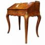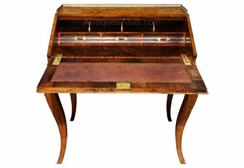 The interior retains its original lock and key, and the piece stands on gracefully shaped legs, with ormolu mounts adding a subtle decorative accent. The warm walnut tone and delicate inlay combine to create a desk of both practical function and decorative appeal.